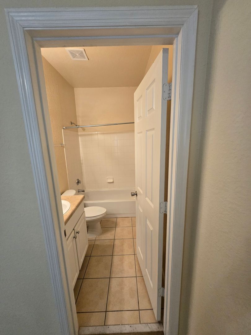 2/2.5 (Magnolia Place) Tiled entry foyer leads to living room/ dining room combination with sliding glass doors that lead to a screened back porch. Kitchen has ceramic tiled floors, white on white appliances, raised counters and dining and serving bar that separates kitchen from dining room. Half bath downstairs. Built in desk under stairwell. Both bedrooms are master suites with baths that have ceramic tiled floors and raised vanities. Double sink vanity in master bath and over-sized tub. Storage closet on screened porch. Community clubhouse with theater, pool, BBQ areas scattered through Playground.