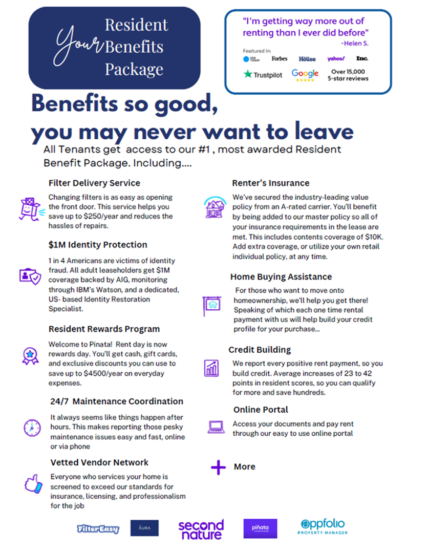All residents are enrolled in a Resident Benefit Package for $39.95 per month. Additional details will be provided upon application.