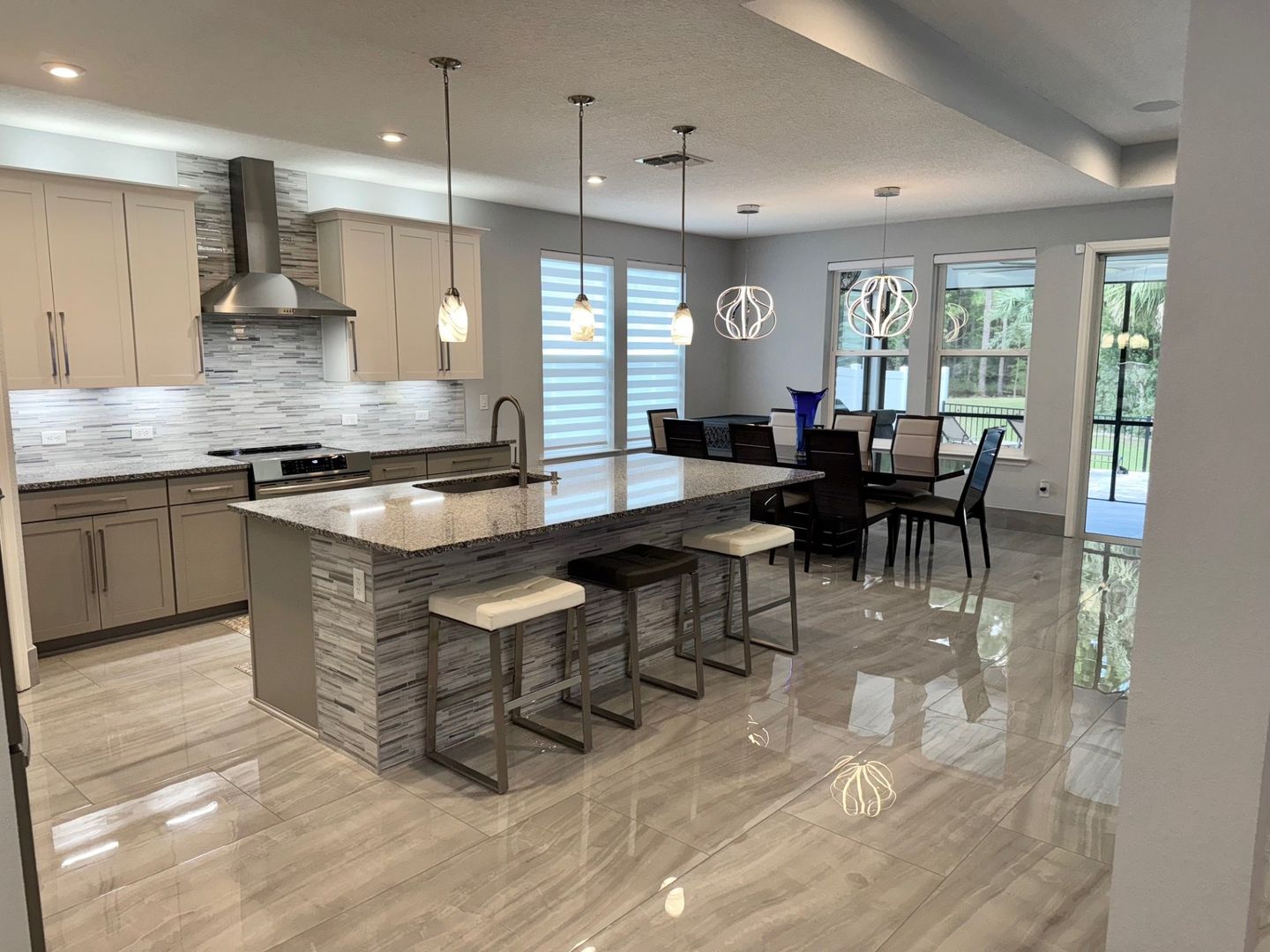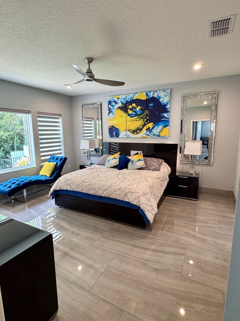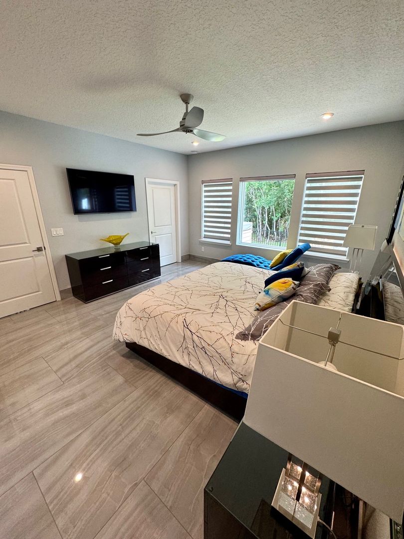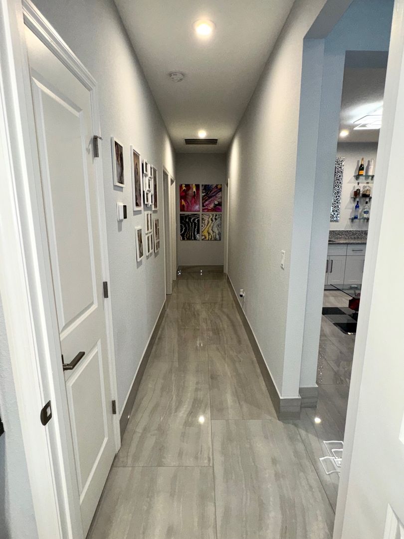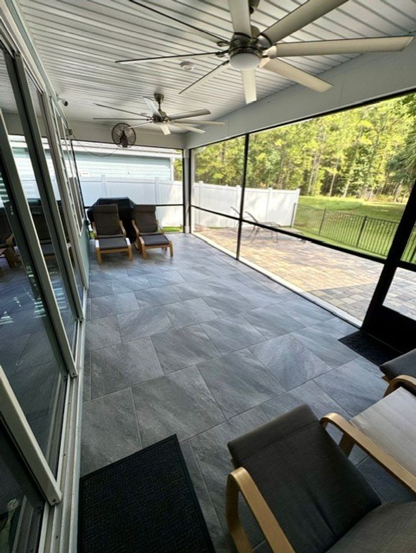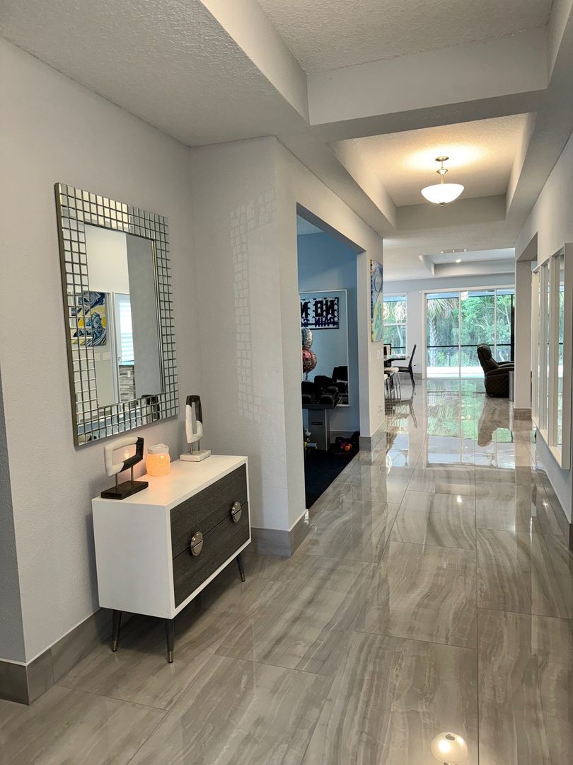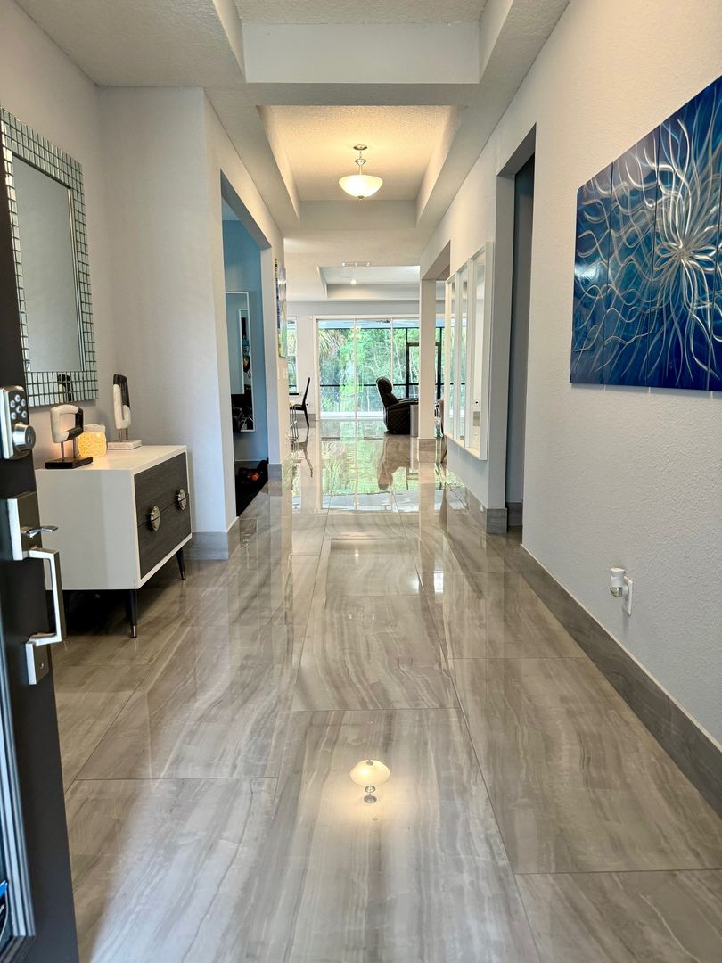 Grand Oaks – 4 Bedrooms | 3 Bathrooms | Flex room which can be used as a home office/gym/3-Car Garage | Preserve Lot. This like-new 2,650 sq ft home is located on a private cul-de-sac preserve lot with no neighbor on one side This move in ready home has plenty of upgrades. The interior highlights include 24" x 48" polished porcelain tile throughout, an upgraded gourmet kitchen with granite countertops, glass tile backsplash, wrapped island, and induction cooktop. The open-concept main living area offers tray ceilings and quad sliding doors leading to the tiled and screened 40' lanai.