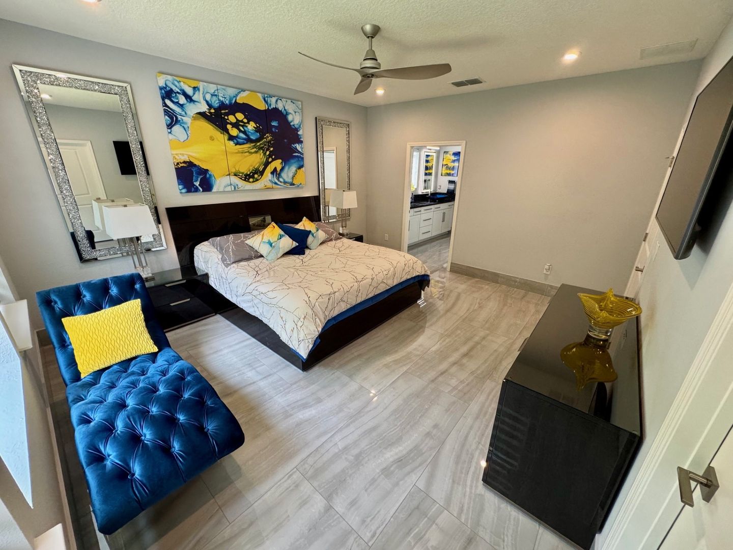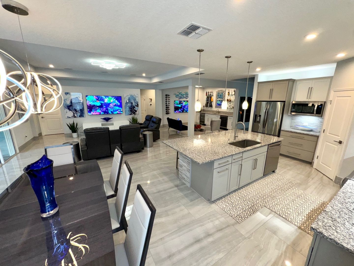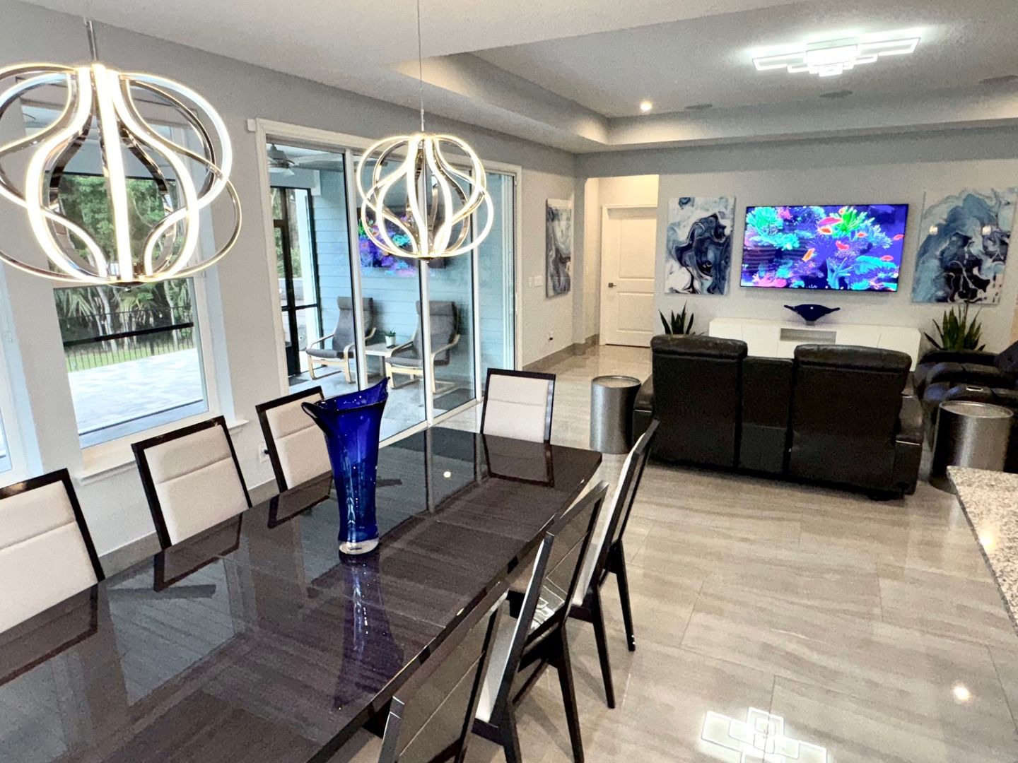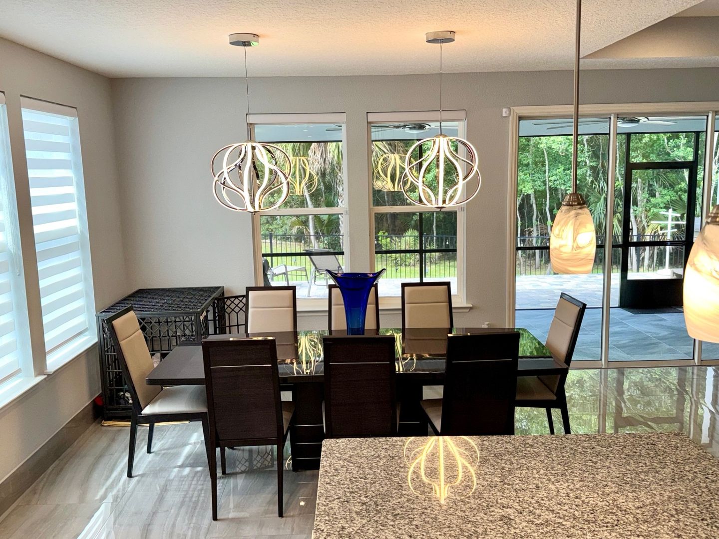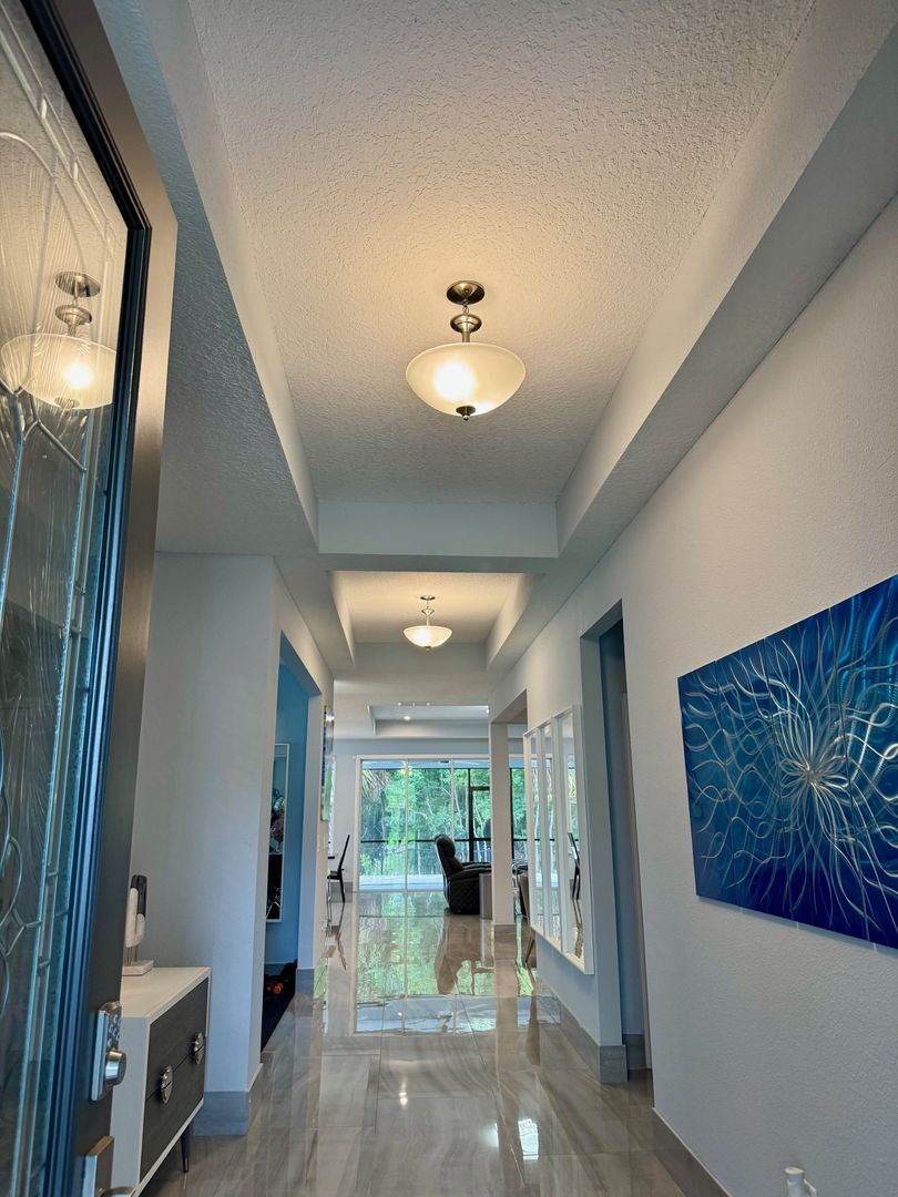 Grand Oaks – 4 Bedrooms | 3 Bathrooms | Flex room which can be used as a home office/gym/3-Car Garage | Preserve Lot. This like-new 2,650 sq ft home is located on a private cul-de-sac preserve lot with no neighbor on one side This move in ready home has plenty of upgrades. The interior highlights include 24" x 48" polished porcelain tile throughout, an upgraded gourmet kitchen with granite countertops, glass tile backsplash, wrapped island, and induction cooktop. The open-concept main living area offers tray ceilings and quad sliding doors leading to the tiled and screened 40' lanai.