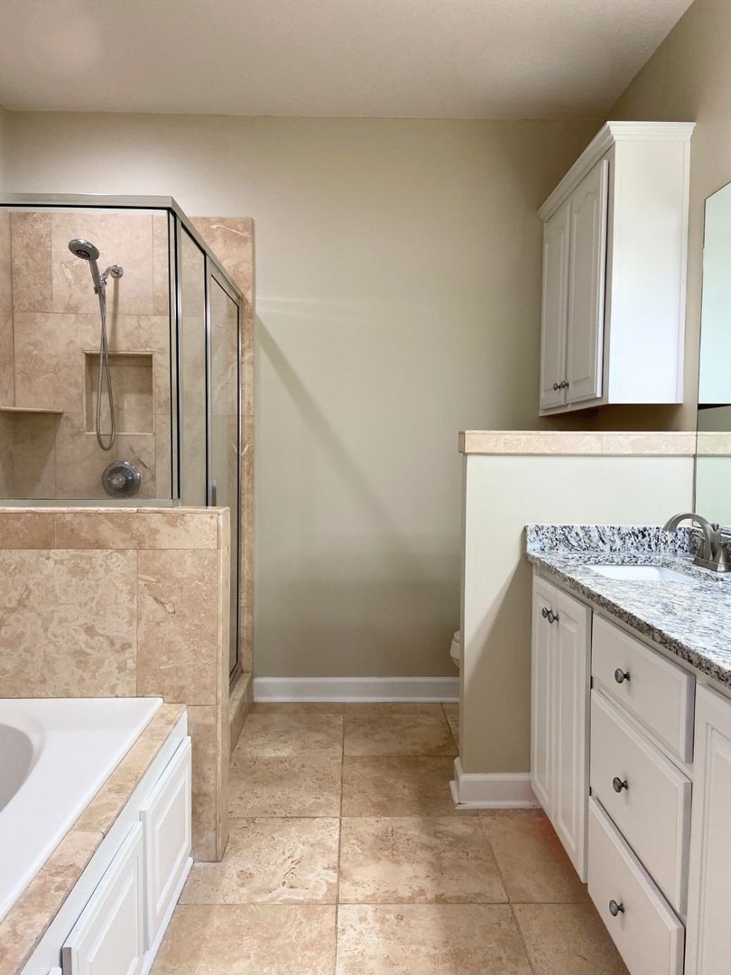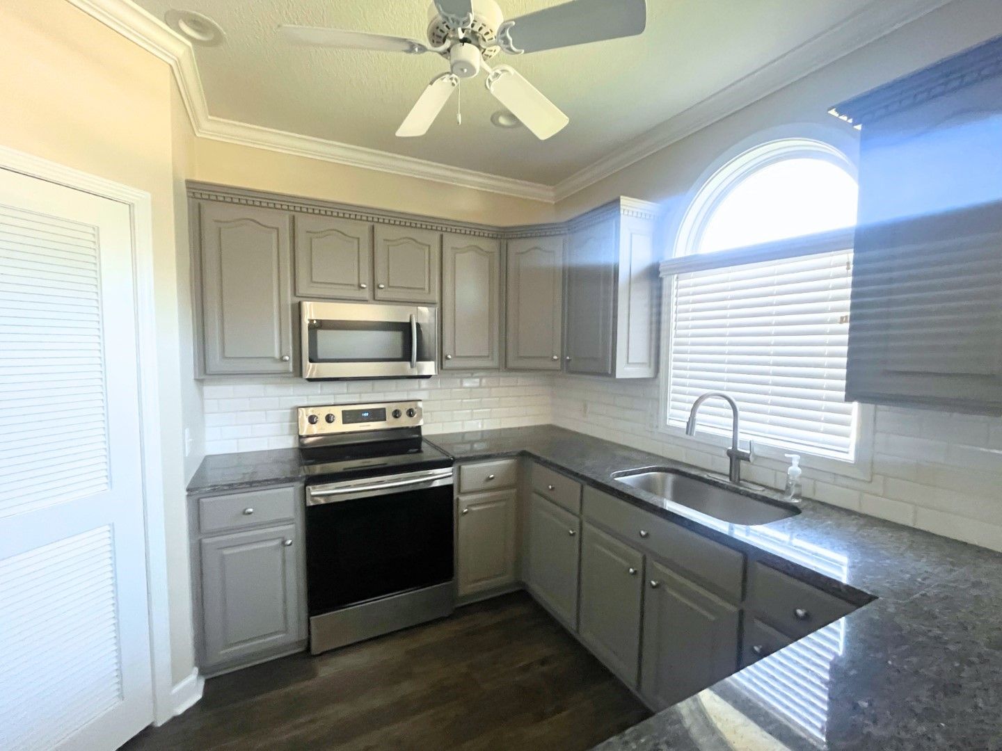 Well maintained with 3 bedrooms with 2 full baths. Modern open floor plan with 9-foot ceilings, big open kitchen with walk-in- pantry, granite countertops, breakfast bar, built in desk. Enjoy beautiful low maintenance wood-look tile flooring throughout the common areas, gorgeous Travertine tile in baths, and plush new carpet in the bedrooms. New interior paint. Primary Suite features a large bathroom with soaking tub and separate shower. Private back yard with deck and screened patio. 1 car attached garage. Easy care exterior- Lawn Care included! Approx 1380sqft of living space.