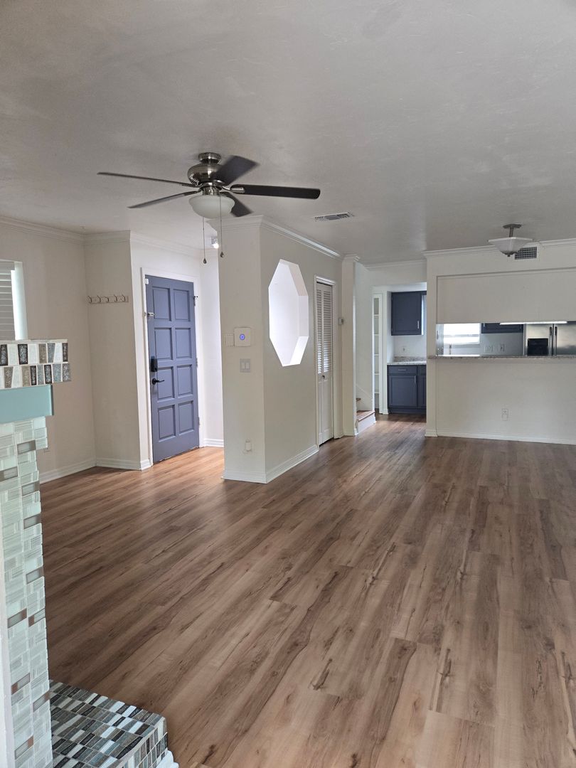 Spacious 2-bedroom, 1.5-bath end-unit townhouse featuring an open floor plan and upgrades throughout. The updated kitchen offers modern countertops and stainless steel appliances, flowing seamlessly into the large living room with a beautifully tiled wood-burning fireplace and charming bay window.