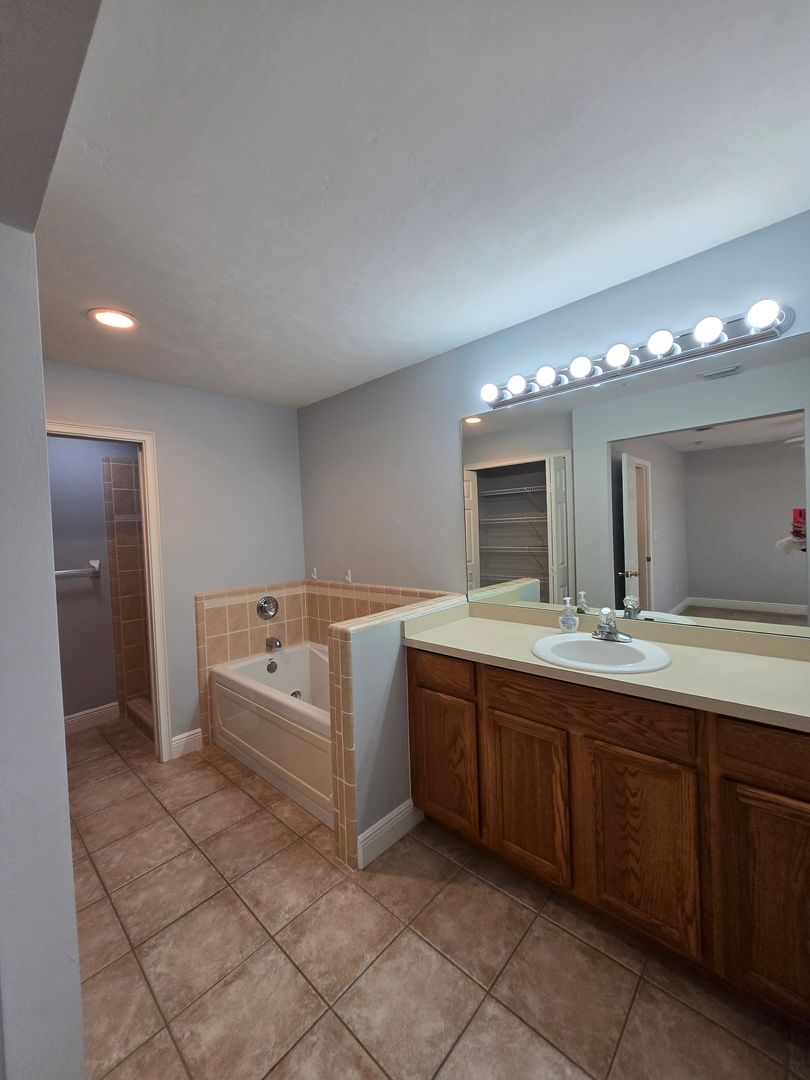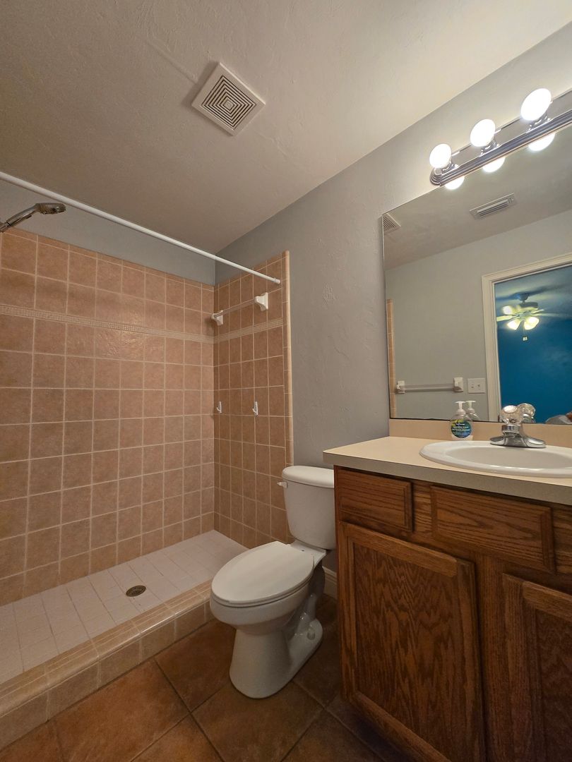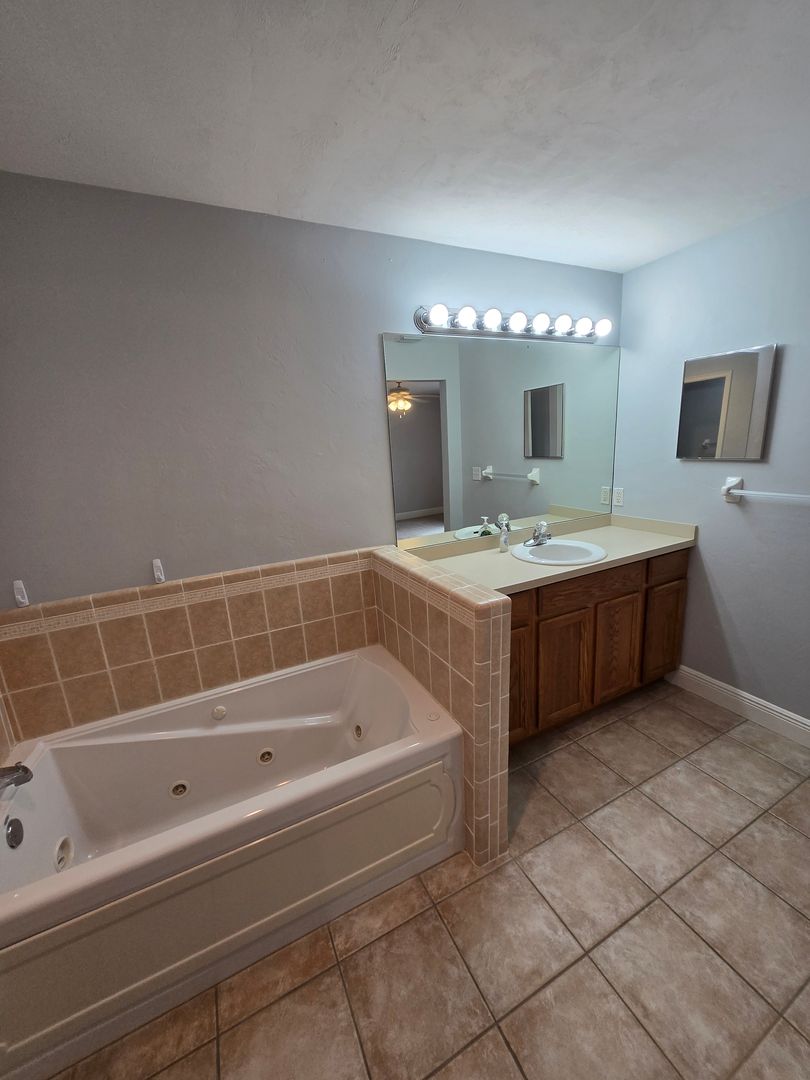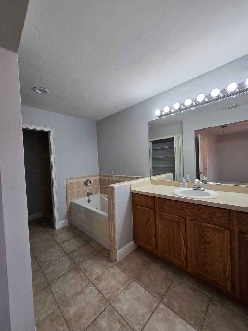Upstairs, the primary suite features an oversized Jacuzzi tub,walk in shower , single-sink vanity, and a spacious linen closet. The second upstairs bedroom has its own private bathroom with a single-sink vanity, tiled shower stall, and tiled flooring. All bedrooms are carpeted for comfort.