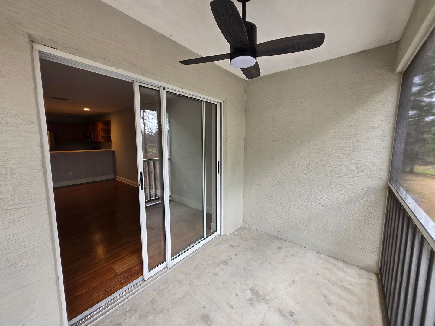 The home features a tiled entry and laminate flooring throughout the main living areas. The spacious living room offers plenty of natural light and sliding glass doors that open to a covered, screened balcony — perfect for relaxing or entertaining. The kitchen provides ample cabinet and counter space, tiled flooring, and stainless steel appliances. This unit also offers plenty of closet space throughout for added convenience and storage.
