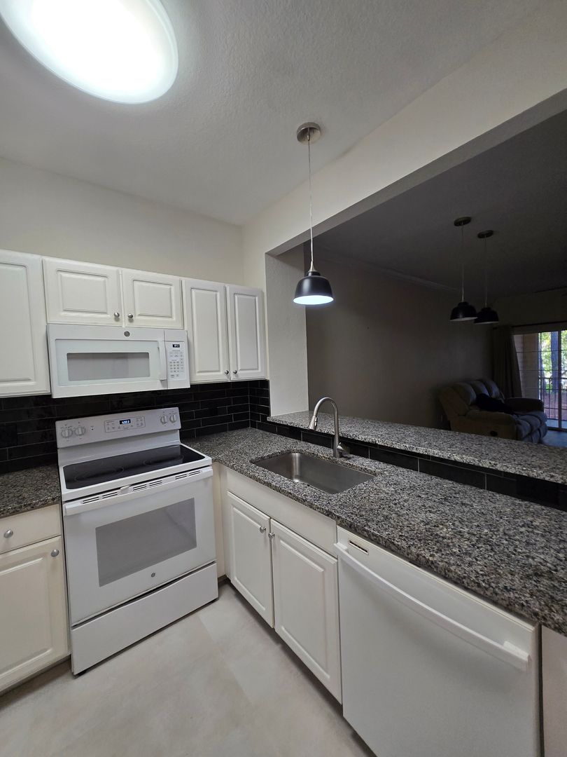 1 Bed / 1.5 Bath Beautifully updated two-story unit 1bed/1.5 bath in Magnolia Place. Featuring new paint, lighting, plumbing fixtures, new luxury vinyl plank flooring and new tile on the first floor, and new carpet in the upstairs bedroom. A tiled entry foyer leads into a bright living and dining room combination that is open to the kitchen. Sliding glass doors lead to a screened back porch with a storage closet and views of the woods. The kitchen has porcelain tile floors, granite countertops, white-on-white appliances, and a dining/serving bar—perfect for entertaining. Half bath is located downstairs and features tiled flooring, tiled accent wall and a single-sink vanity with a granite top. A built-in nook is located in the entry hallway. Washer and dryer closet with washer and dryer included for added convenience. Upstairs, the spacious bedroom includes a large walk-in closet and vaulted ceilings. There is also a remodeled en-suite bathroom with a double-sink vanity featuring granite countertops, and a walk-in tiled shower. The unit offers ample storage and closet space throughout. Community amenities include a clubhouse, pool, gym, BBQ areas located throughout the community, and a playground. All of this in a great location that is convenient to everything.