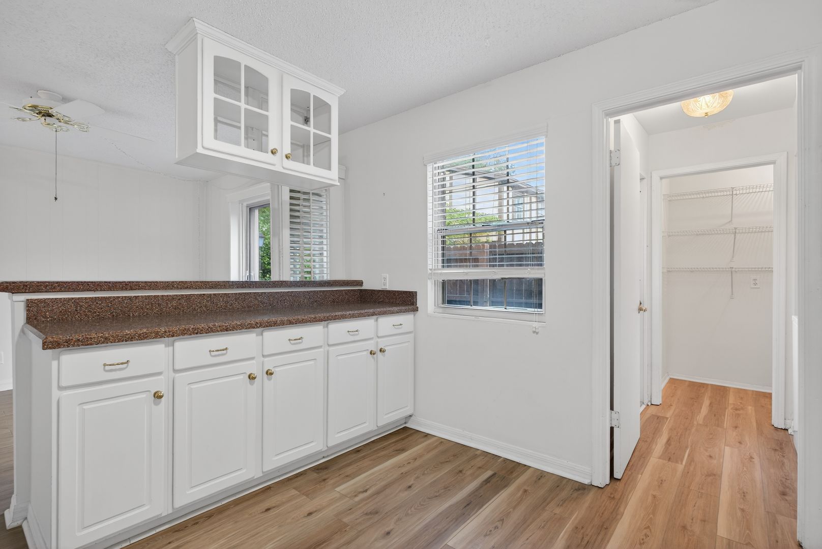 Spacious and inviting townhome-style condo featuring a thoughtfully designed downstairs living area filled with natural light—perfect for both relaxing and entertaining. The kitchen is well-appointed with engineered granite countertops, a smooth-top range, microwave, dishwasher, disposal, and elegant wood cabinetry with glass-front accents, along with a refrigerator equipped with an ice maker. A convenient walk-in pantry adds extra storage.