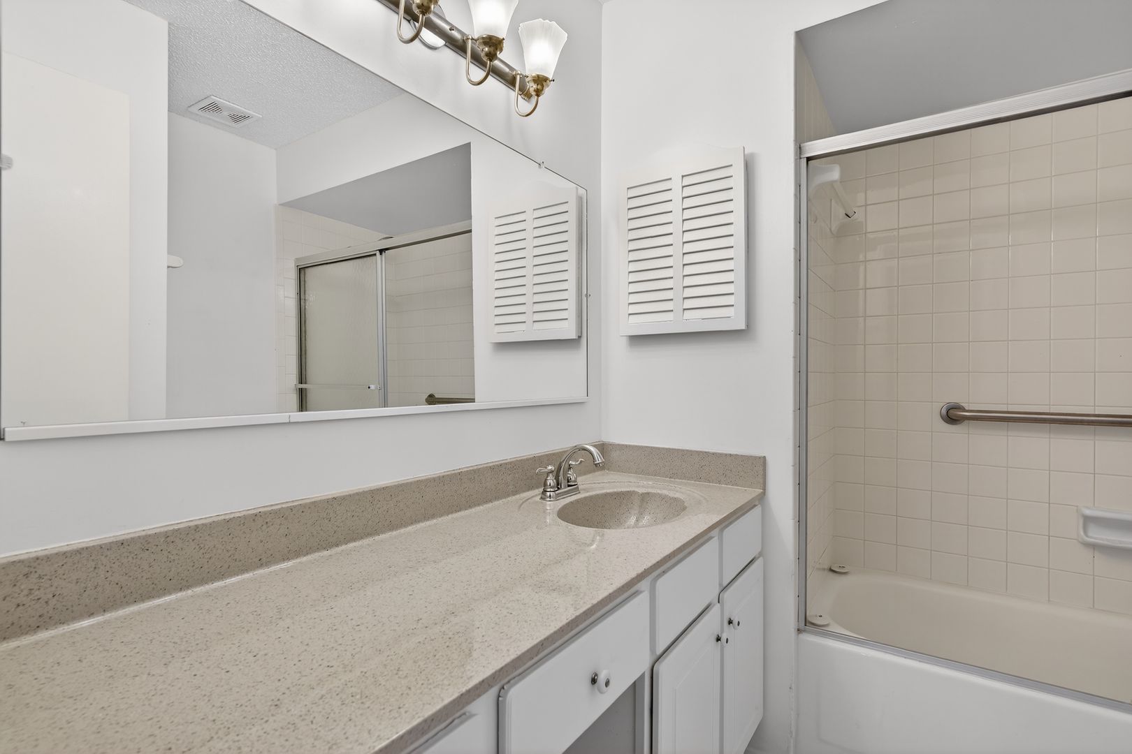 Enjoy indoor-outdoor living with double sliding doors in the kitchenette, enhanced by plantation shutters, leading to a private outdoor patio. Upstairs, the spacious primary bedroom offers comfort and privacy, complete with an adjoining bathroom featuring a tub and shower, as well as three closets for ample storage. Two additional guest bedrooms and a full guest bathroom with tub and shower complete the upper level.