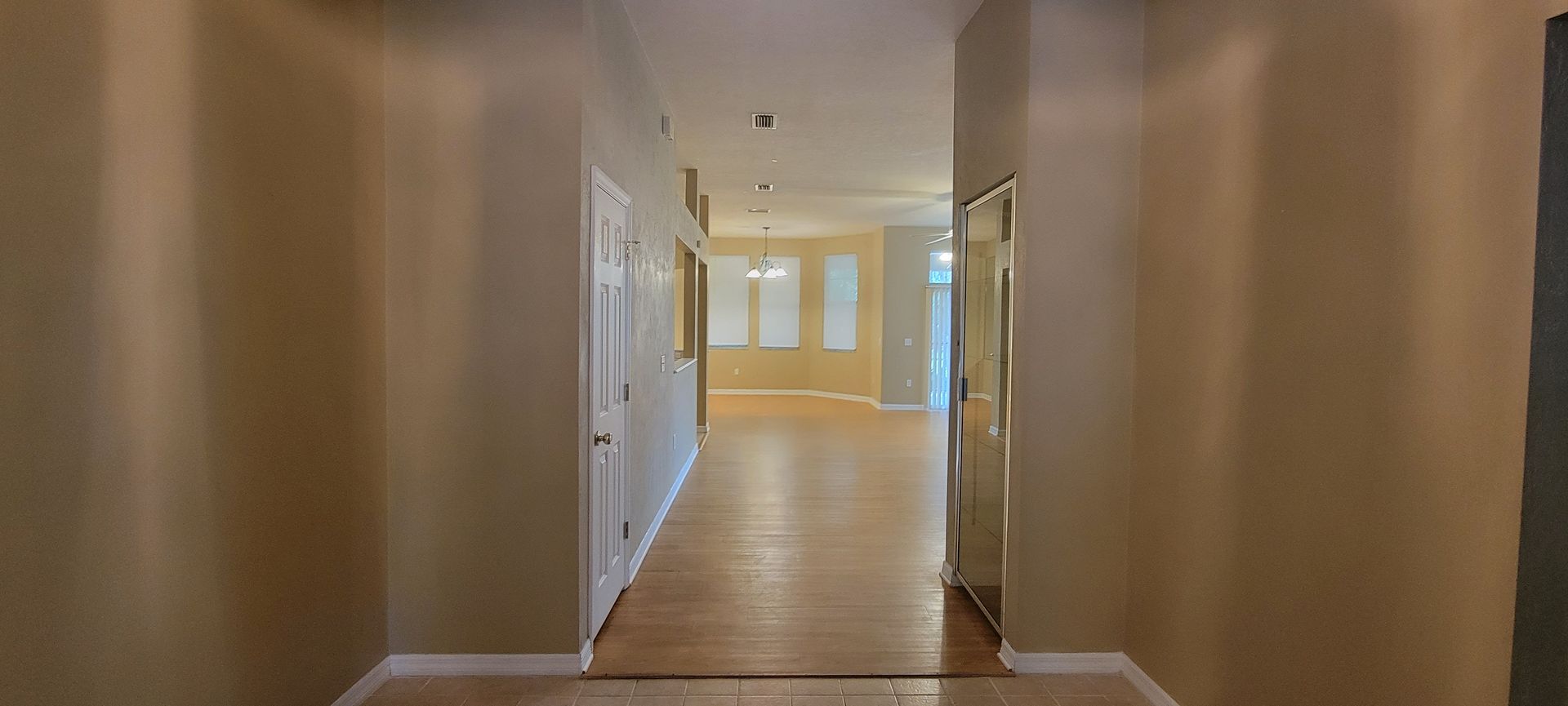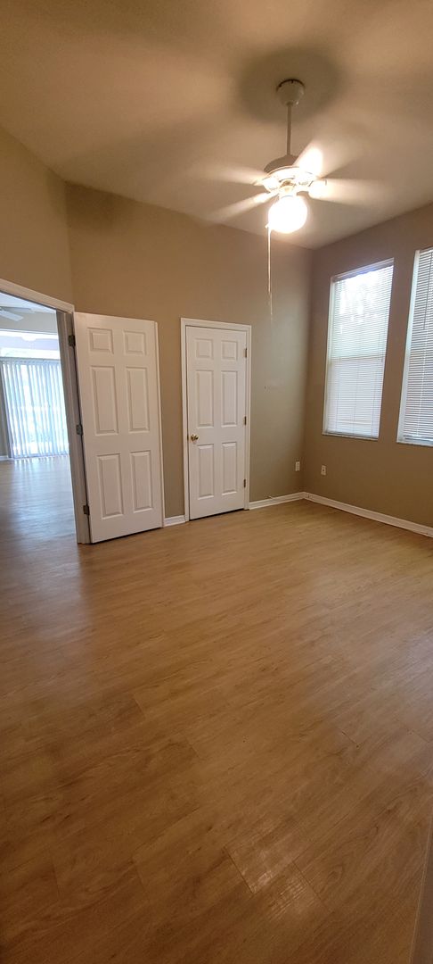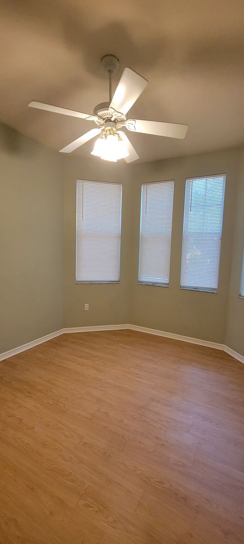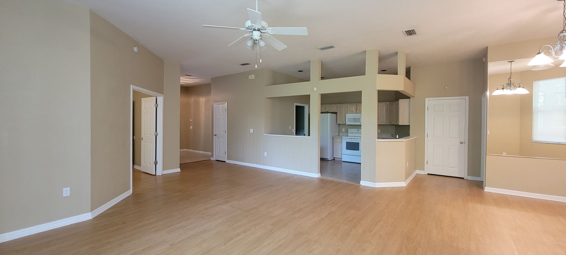 Large entry foyer leads to spacious living room with vaulted ceilings and laminate wood floors. Sliding glass door off of Living room leads to screened Lanai and side wood deck. Living room has one wall of windows that overlooks backyard. Dining room has a large mirrored wall. Front bedroom has bay window and planter shelves. Kitchen has ceramic tiled floors, white washed oak cabinets and white on white appliances. Large master bath has tiled floors, separate dressing area, Jacuzzi tub, skylight and corner ceramic tiled shower. Two car garage and Utility room with washer and dryer. 1 pet - small/medium breed. NO COSIGNERS!