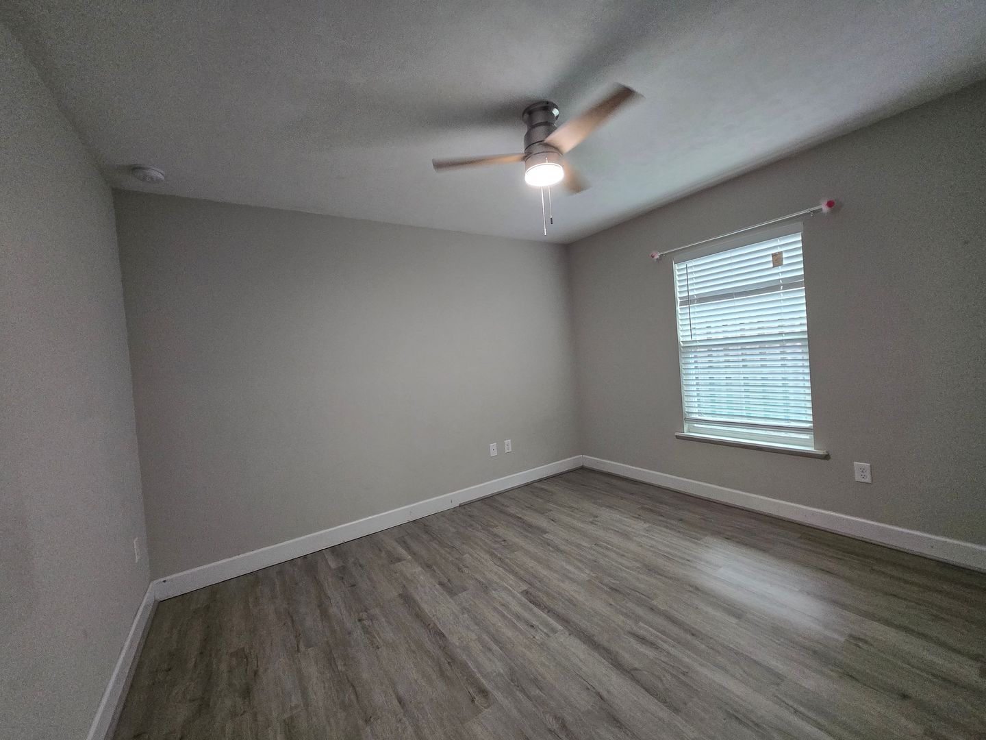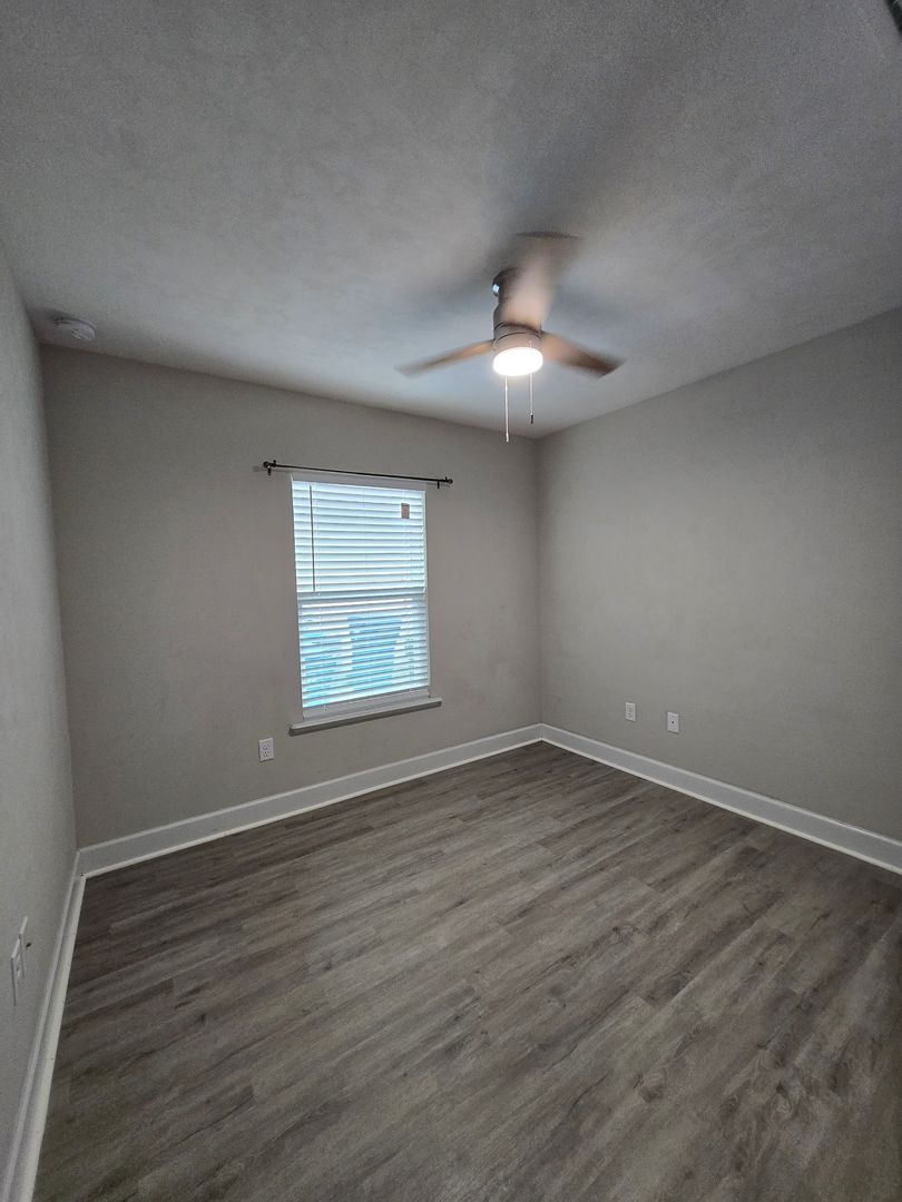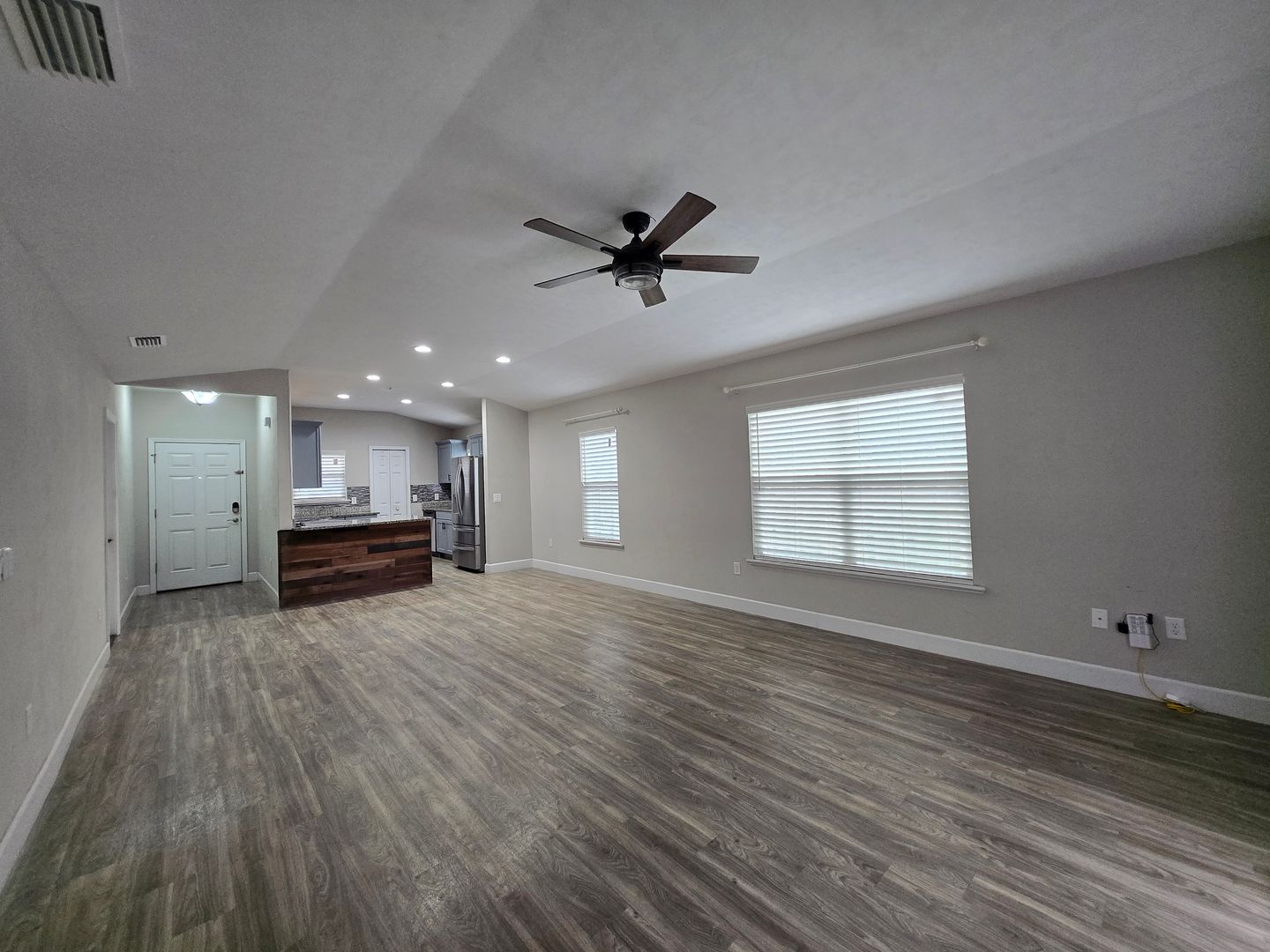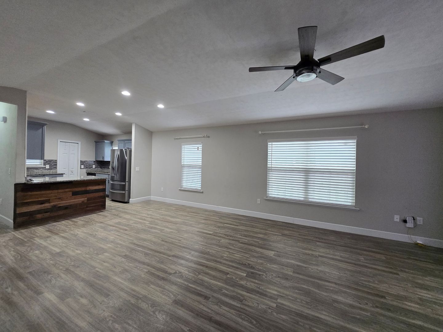 The spacious living room has luxury vinyl plank flooring that flows seamlessly throughout the main living areas and bedrooms, offering both style and durability.