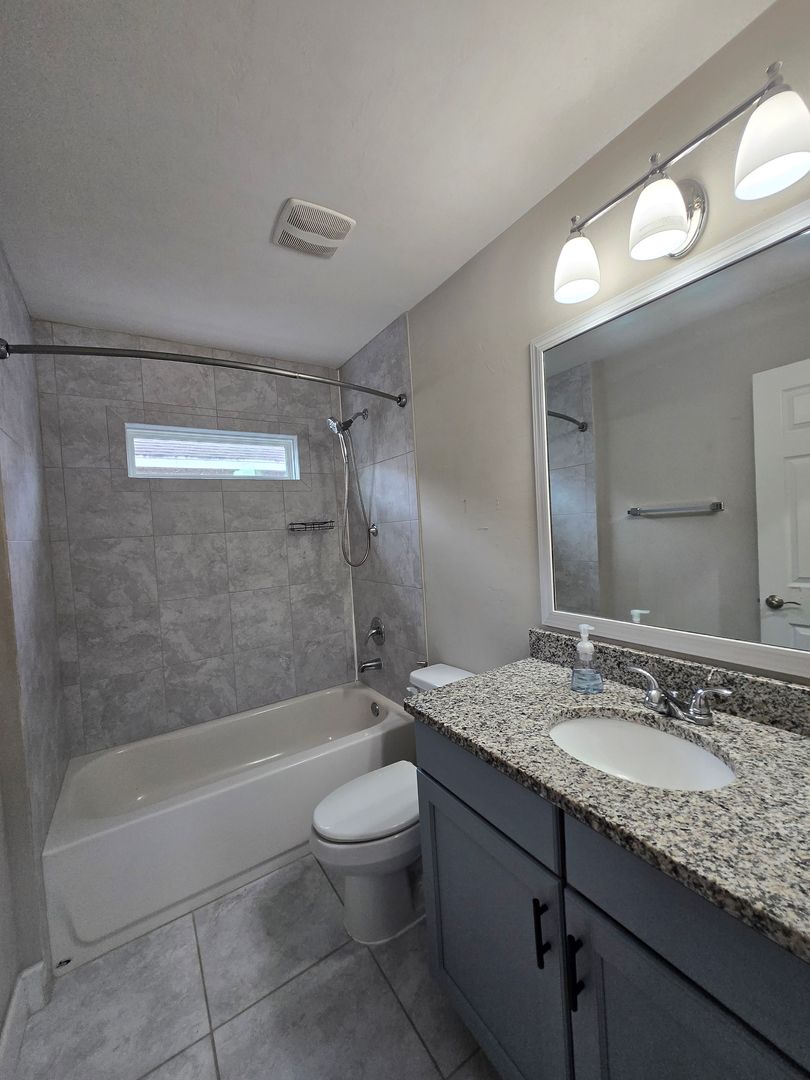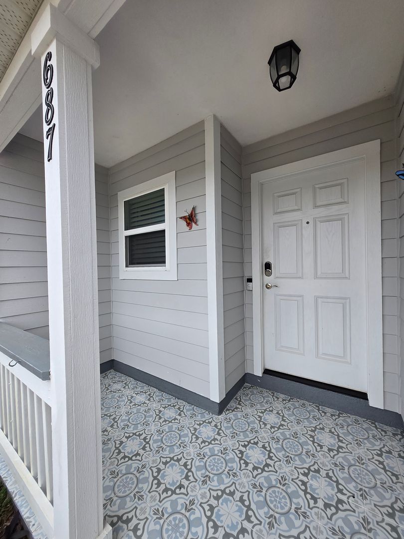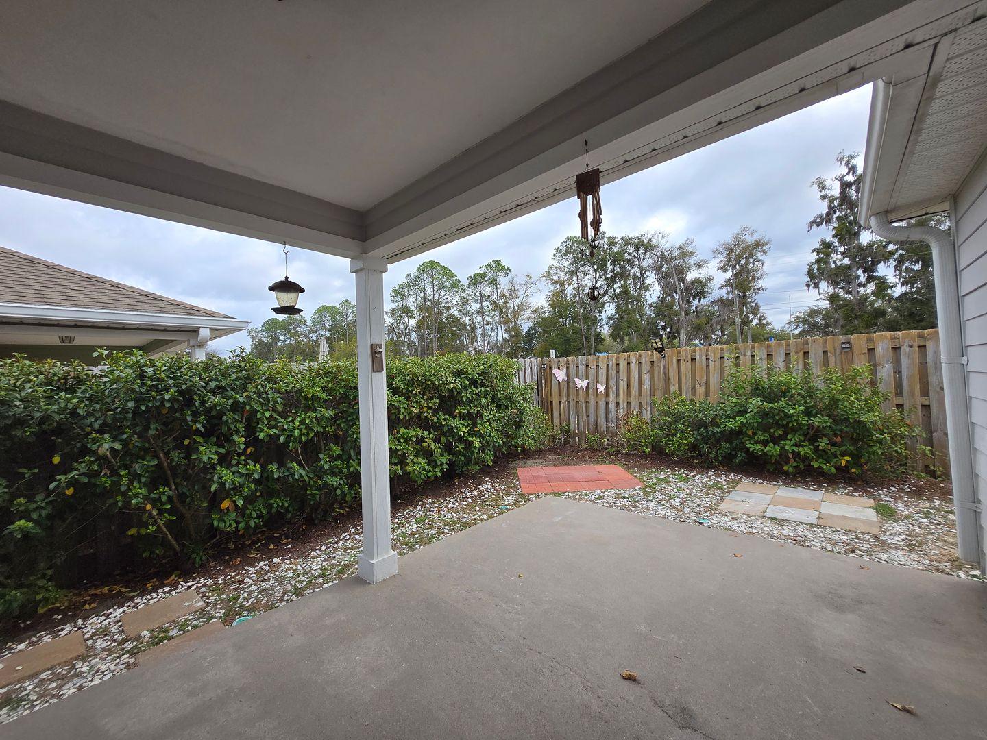 Both guest bedrooms include custom-built closet systems, and the home offers an abundance of closet and storage space throughout. The guest bathroom features tiled flooring, a single-sink vanity with a granite countertop, and a tub/shower combination. Additional highlights include a large laundry/utility room with washer and dryer hookups, a covered front porch with decorative tile, a two-car garage, and a fully fenced backyard with a covered patio — ideal for relaxing or entertaining outdoors. Conveniently located within walking distance to Oak View Middle School, Newberry Elementary, and Newberry High School.