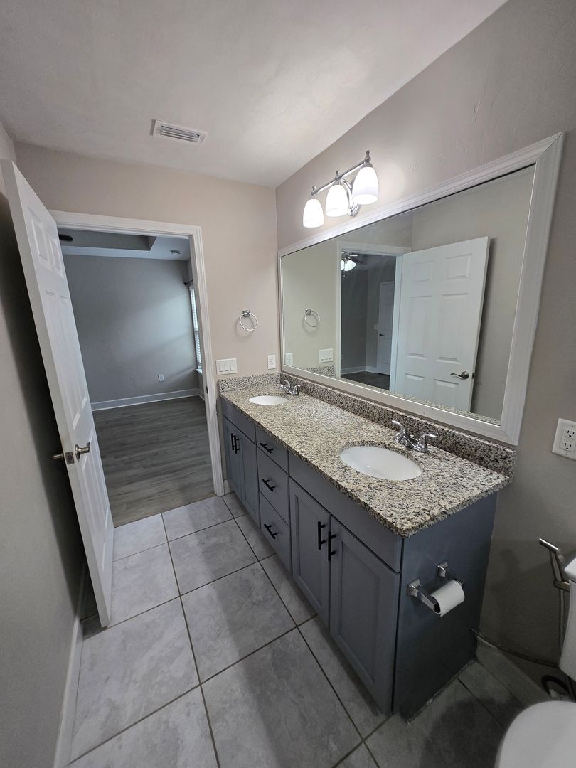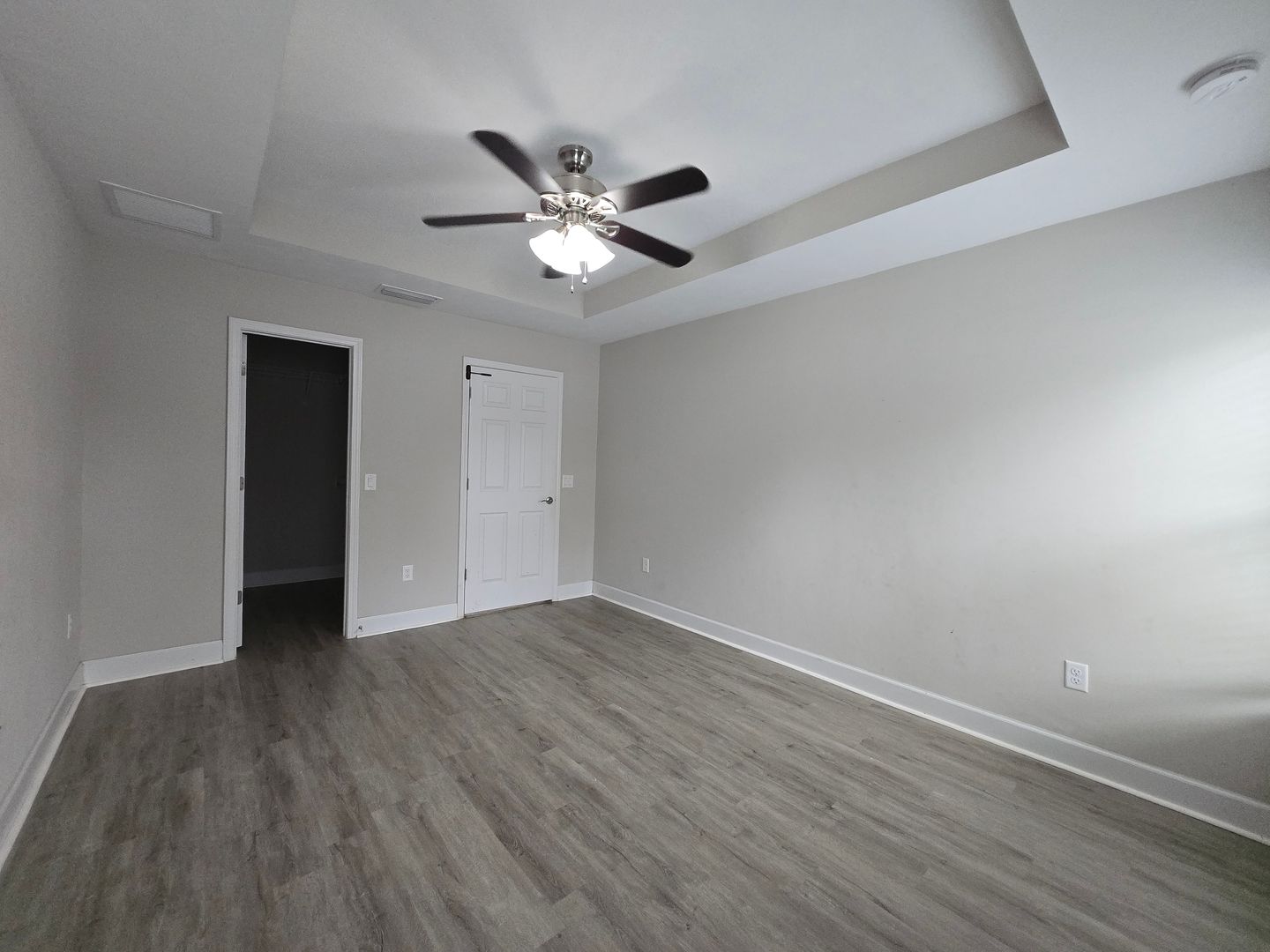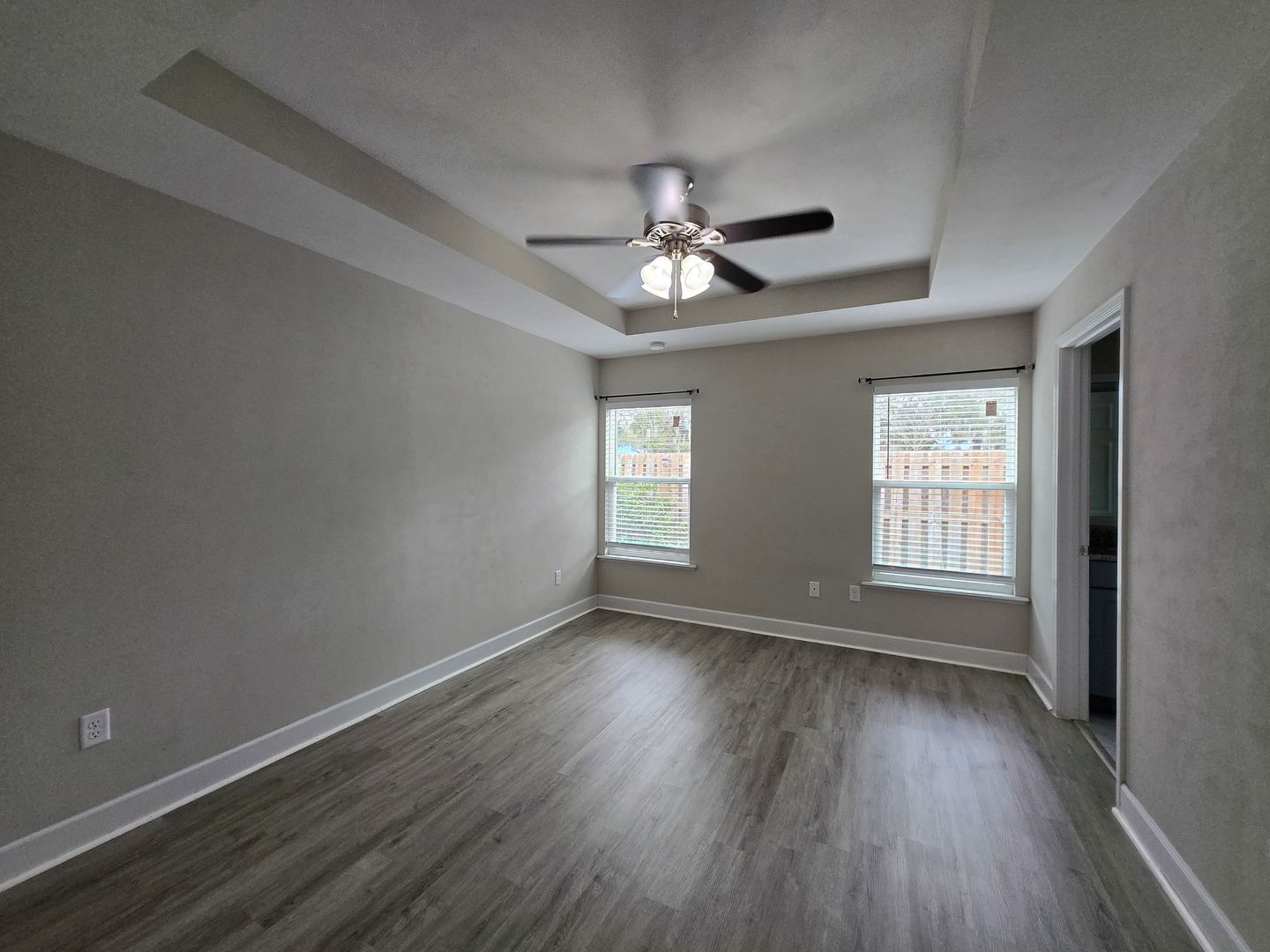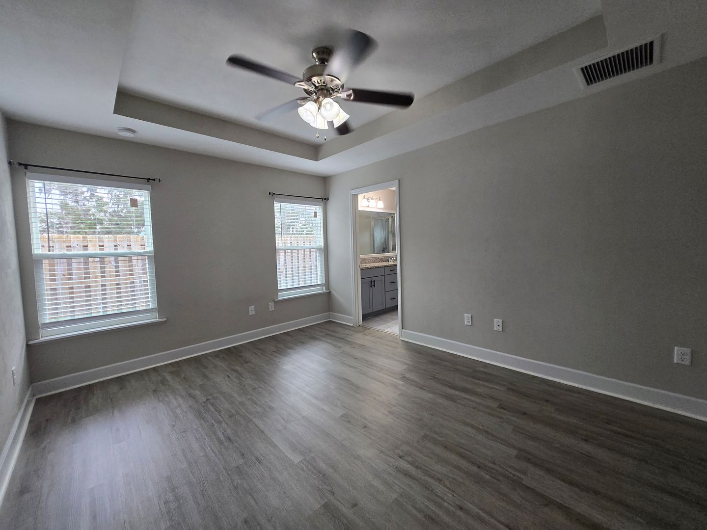 Master bedroom features tray ceilings, a walk-in closet, and a master bathroom with dual vanities, granite countertops, tiled flooring, and a walk-in shower.