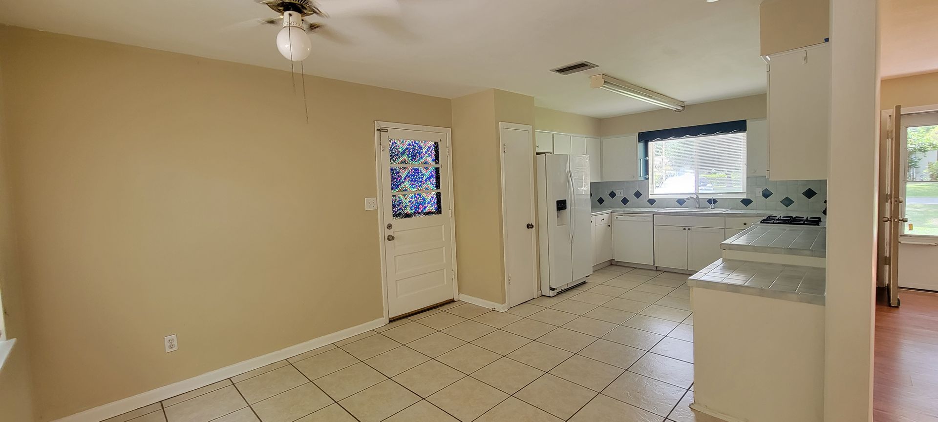 4/2 (Madison Park) Nice home in quiet neighborhood close to schools, shopping and parks. Spacious living room with laminate wood floors and large picture window for lots of natural light. Step down into family room ( space not heated or cooled) that has laminate wood floors, built in desk space, and 5 sets of sliding glass doors that lead to nice fenced back yard with patio area. Utility room with washer dryer connections off hall. Bedrooms have tiled floors. Spacious kitchen with ceramic tile counter tops and plenty of counter and cabinet space. Dining room off kitchen. One car carport with storage room. Est. heated and cooled sq. ft. 1982. Total 2390