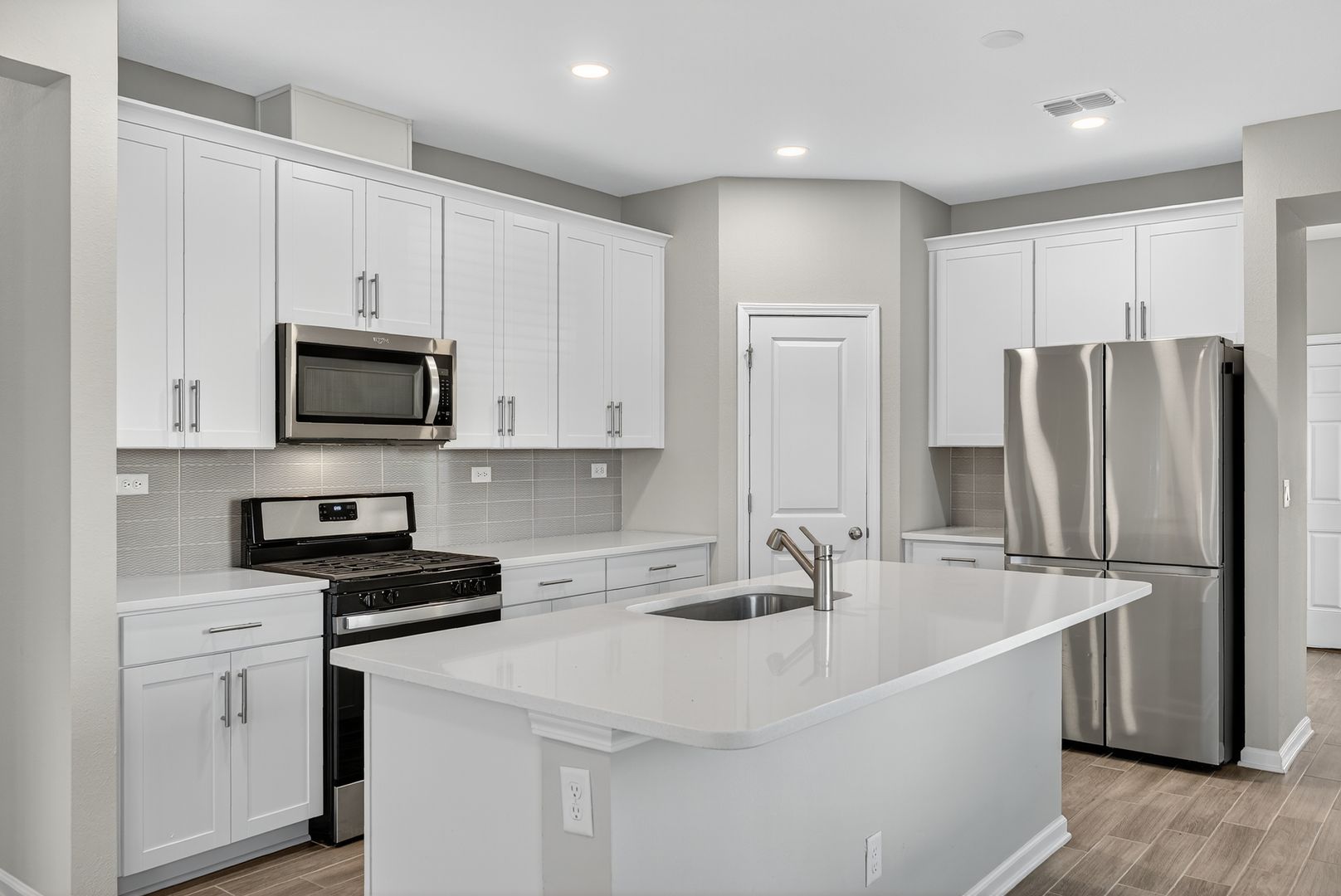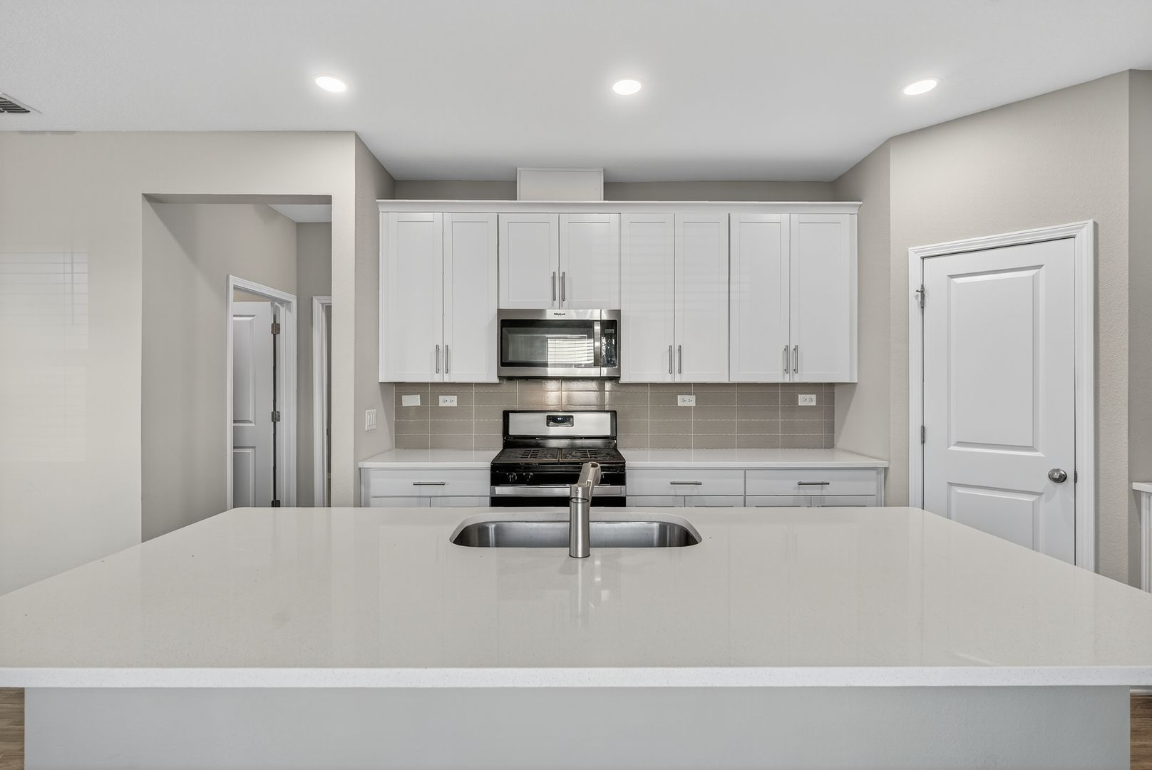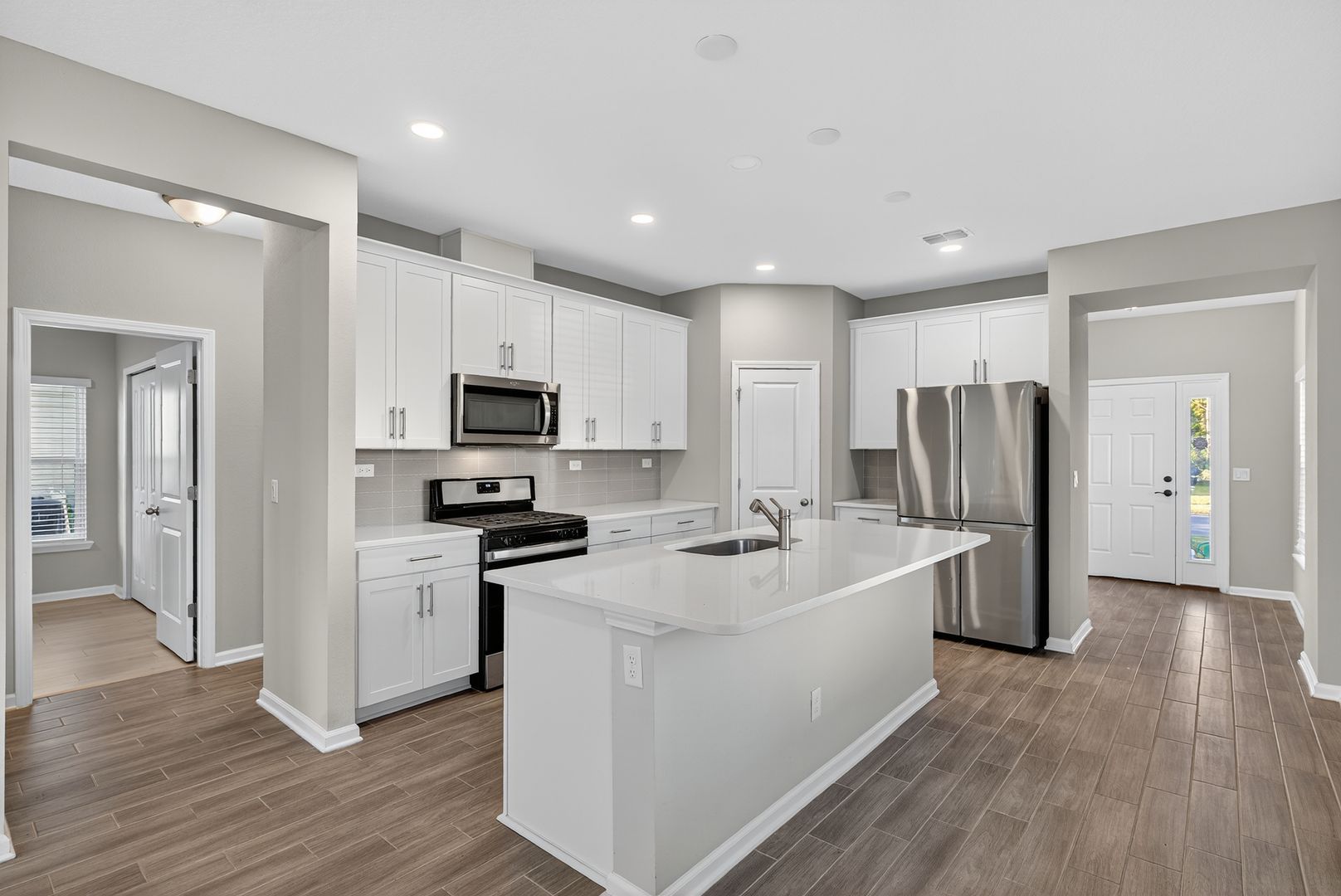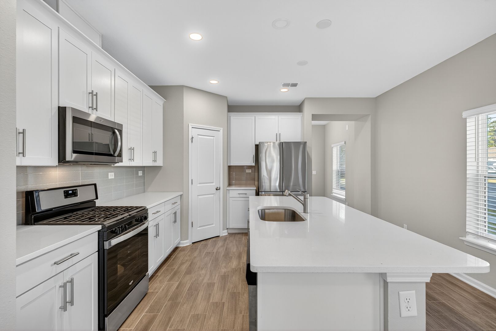 Welcome home to this stunning 3-bedroom, 2-bath residence offering modern upgrades and an inviting open-concept layout. The chef-inspired kitchen boasts a Whirlpool gas range, exterior-vented microwave, quartz countertops, upgraded white cabinetry, tile backsplash, and a spacious island—perfect for cooking and gathering.