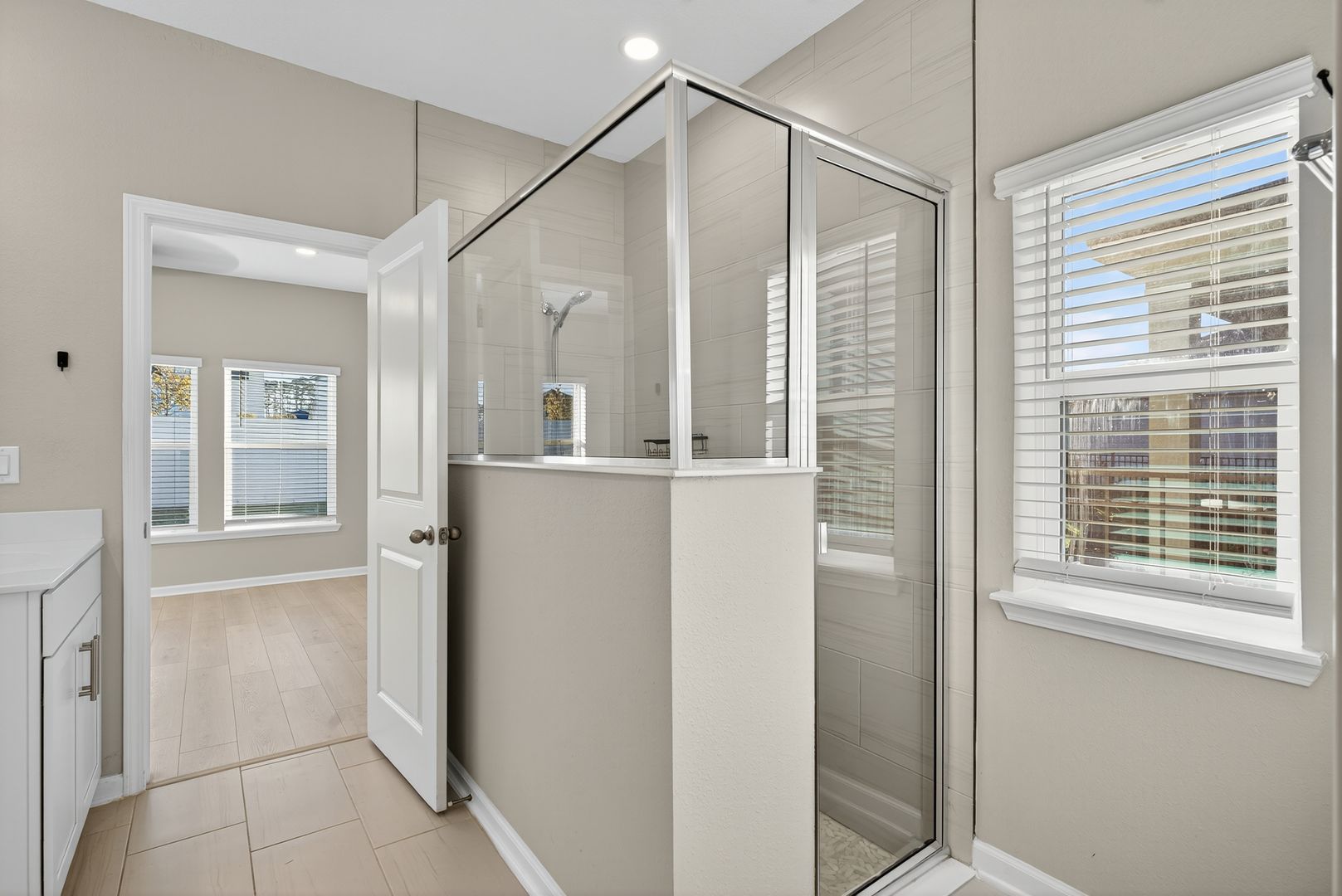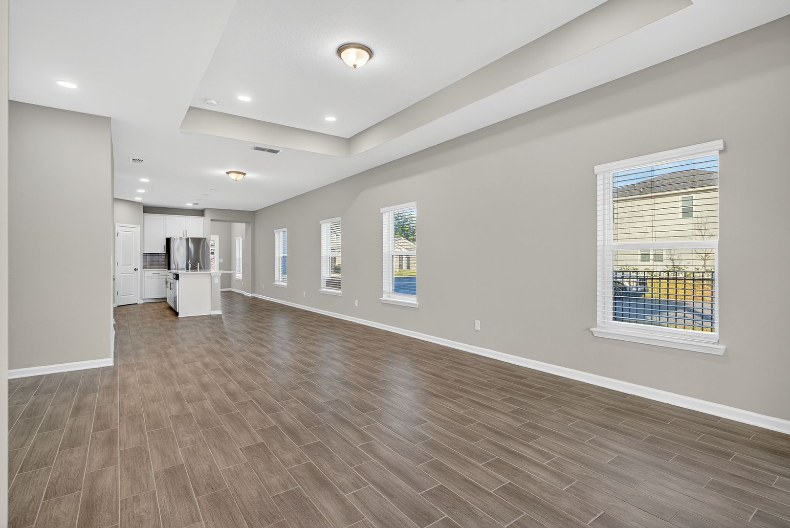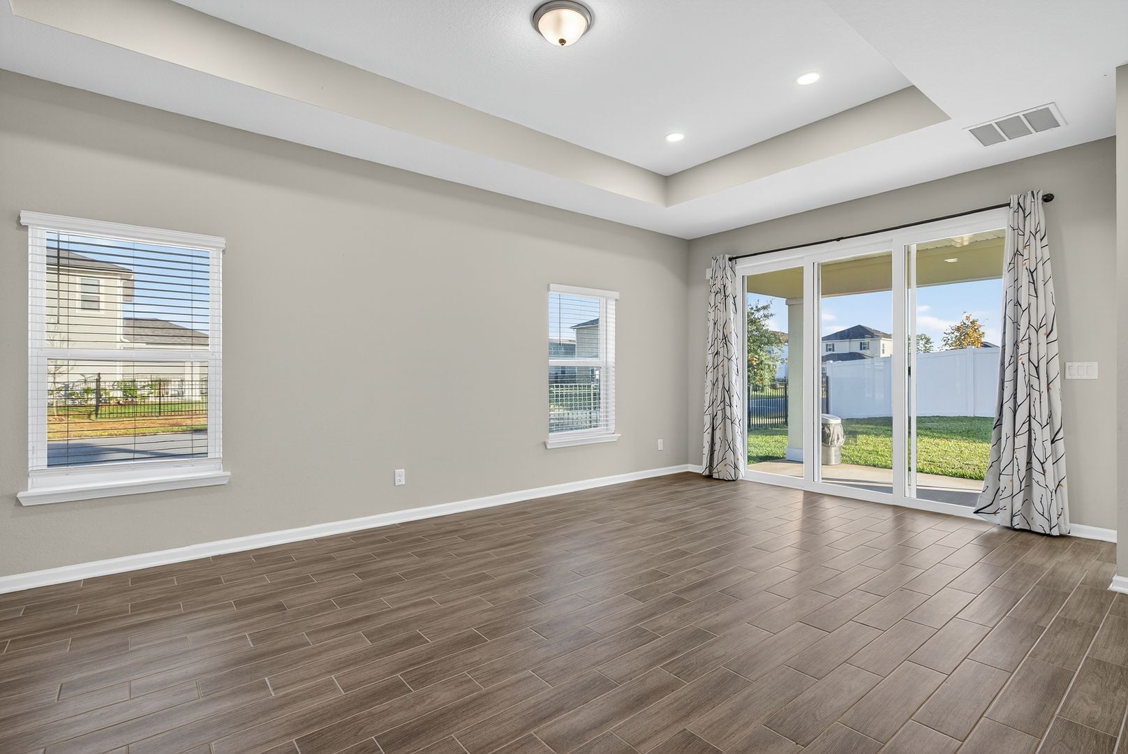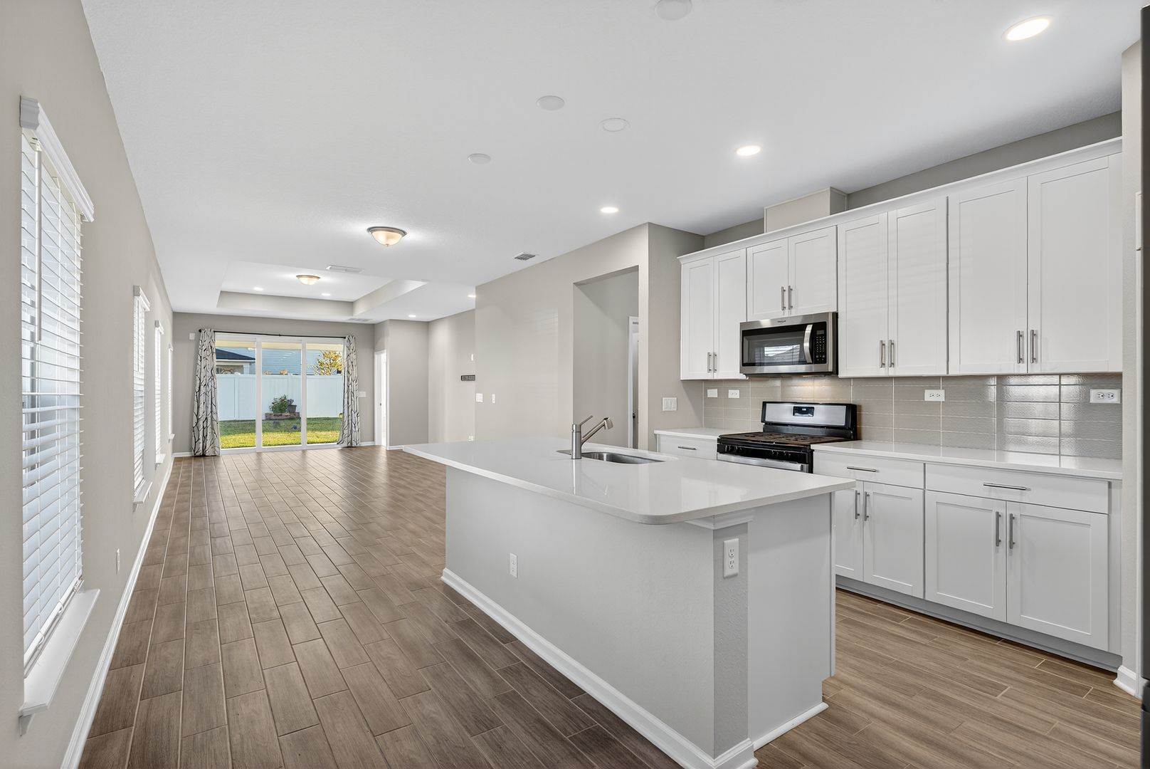 The great room features a stylish single tray ceiling and opens through a dramatic 9080 triple slider to the covered lanai, creating the ideal indoor-outdoor living experience. LVP Flooring adds warmth and durability throughout all common and wet areas. Located in a sought-after natural gas community, this home combines comfort, efficiency, and designer touches throughout.
