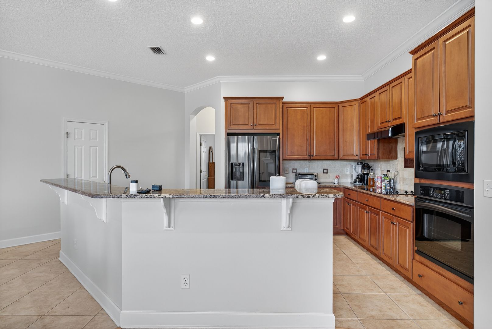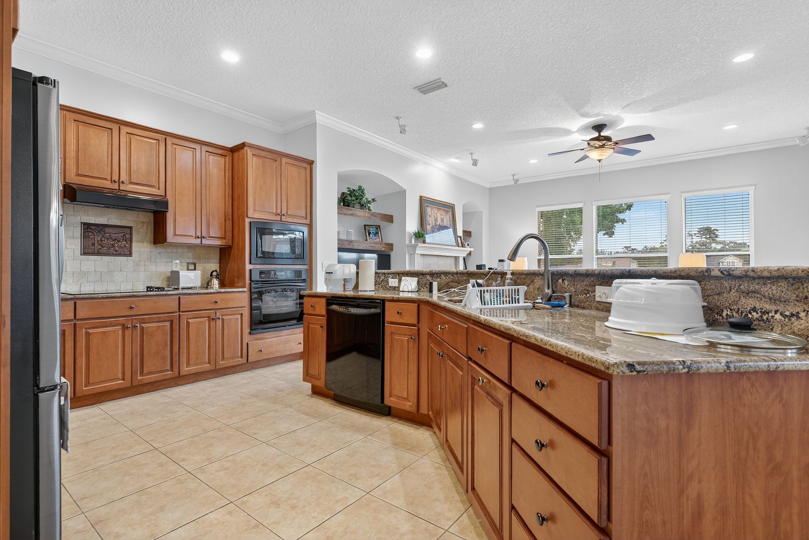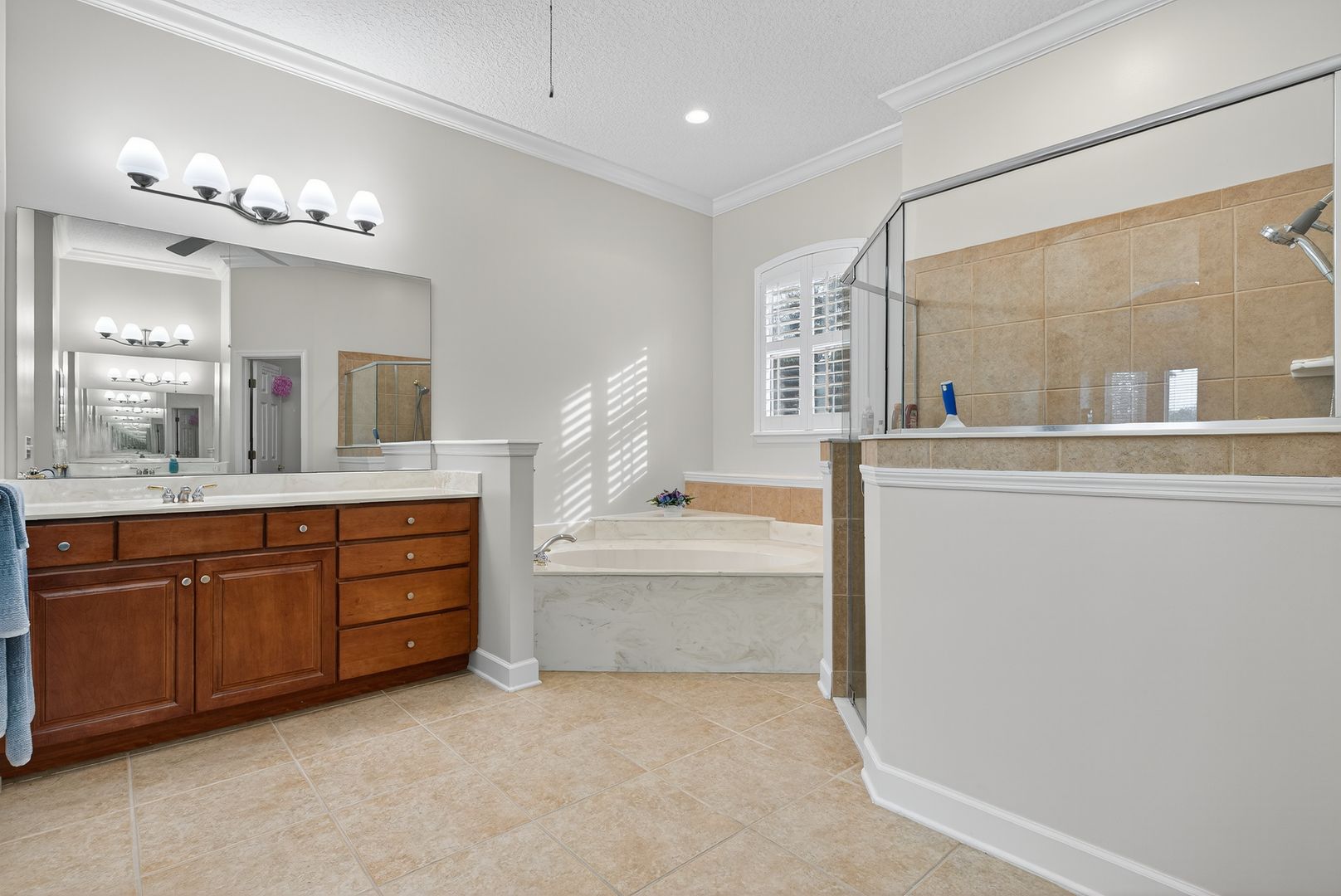 Inside, you’ll find generously sized bedrooms, including a luxurious owner’s suite featuring his and hers walk-in closets. The primary bathroom has his and her vanities, garden tub and separate shower. The heart of the home, the fully equipped spacious kitchen with stainless steel appliances seamlessly connects to the dining area and family room — a layout designed for both intimate meals and large gatherings.