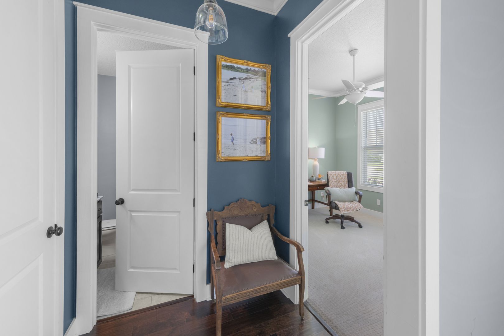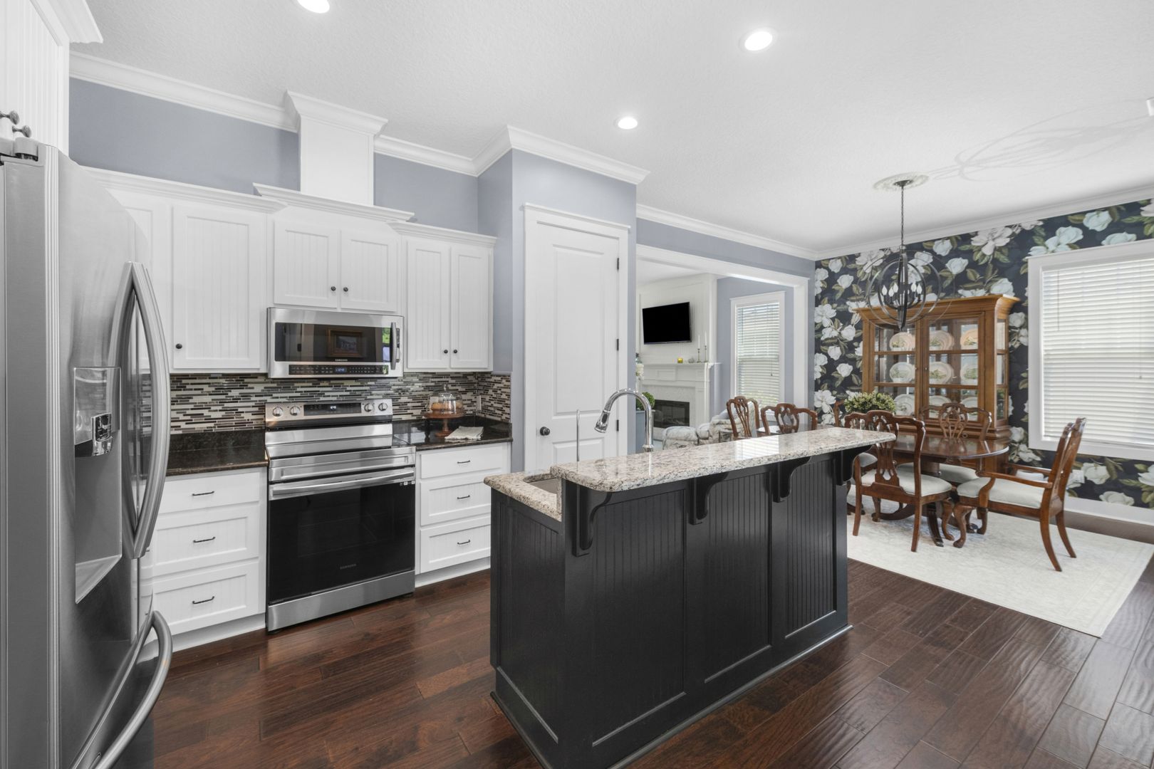 Hardwood floors flow through the open living area with fireplace and the formal dining room. The eat-in kitchen offers granite countertops, updated stainless steel appliances, and a breakfast bar. The primary suite includes a double vanity, private water closet, and a large walk-in shower. The main level also features a guest bedroom, half bath, indoor laundry/mud room, and convenient storage under the stairs.