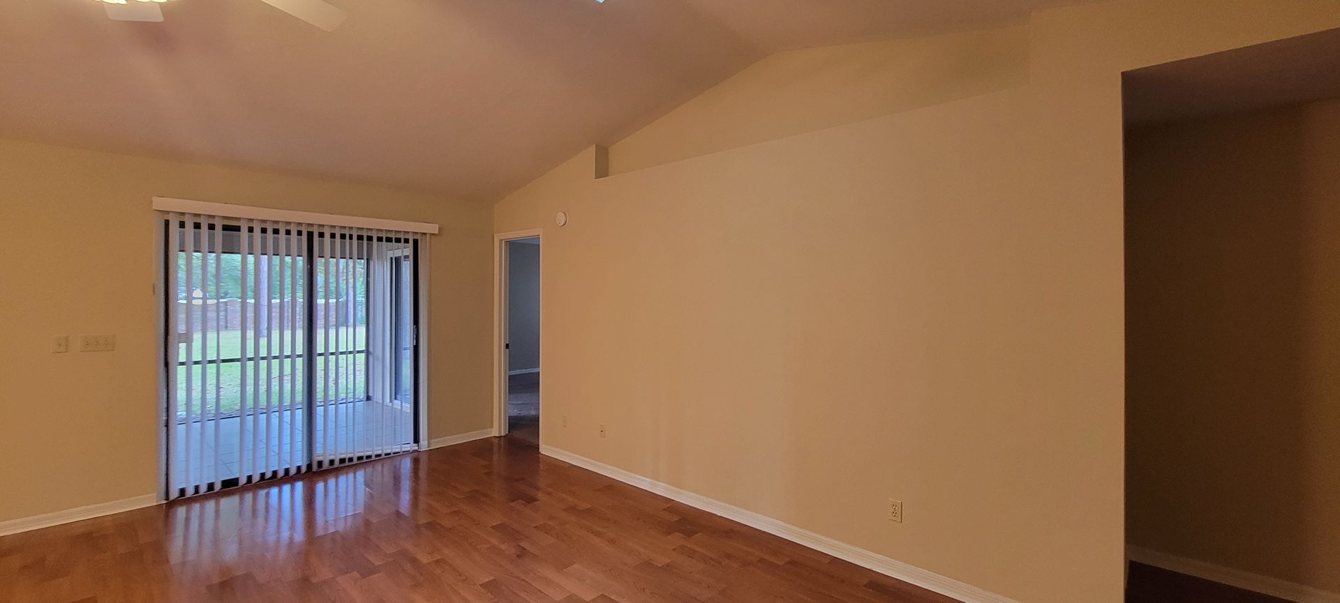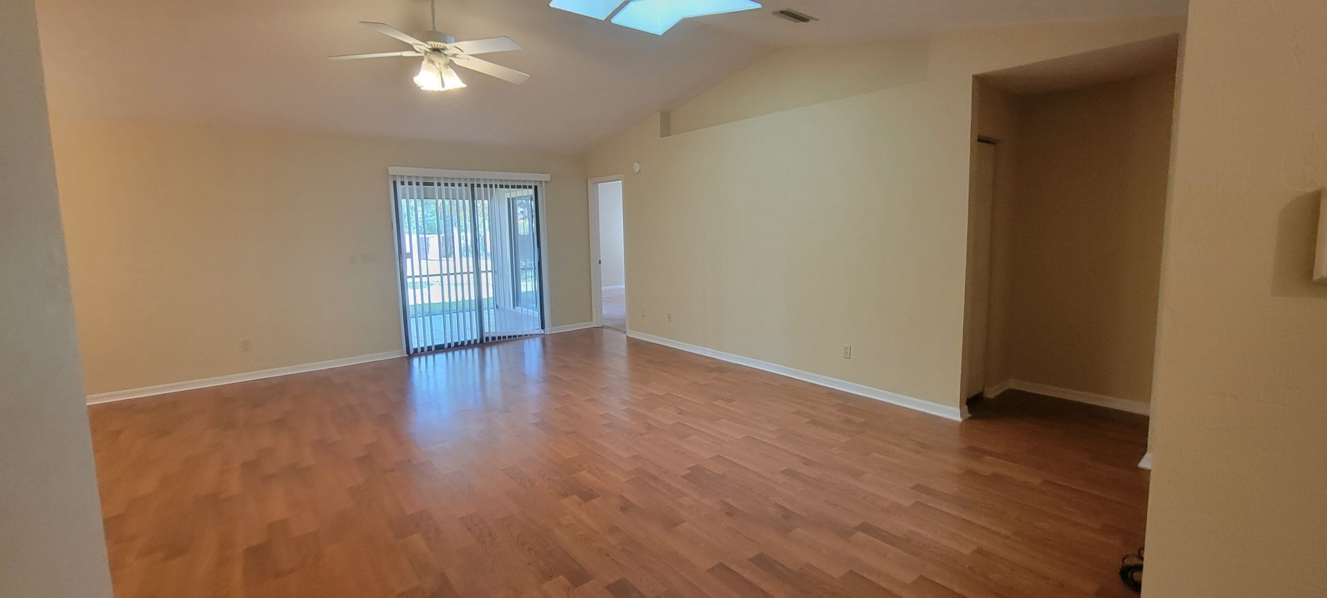 3/2: Enjoy this nice spacious home in Sunrise. Updated kitchen opens onto the family room with white cabinetry with plenty of cabinet & counter space . Laminate wood flooring in living / dining space. Master bedroom has a large walk in closet. Master bath has one sink vanity and tub/ shower combo. Utility room with washer & dryer connections. Large screened porch, fully fenced backyard and additional patio space for entertainment. Alarm system not activated, 2 car garage.