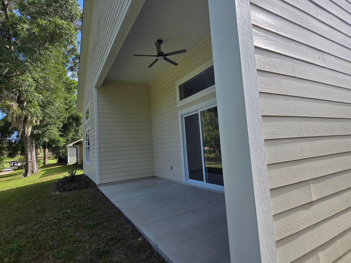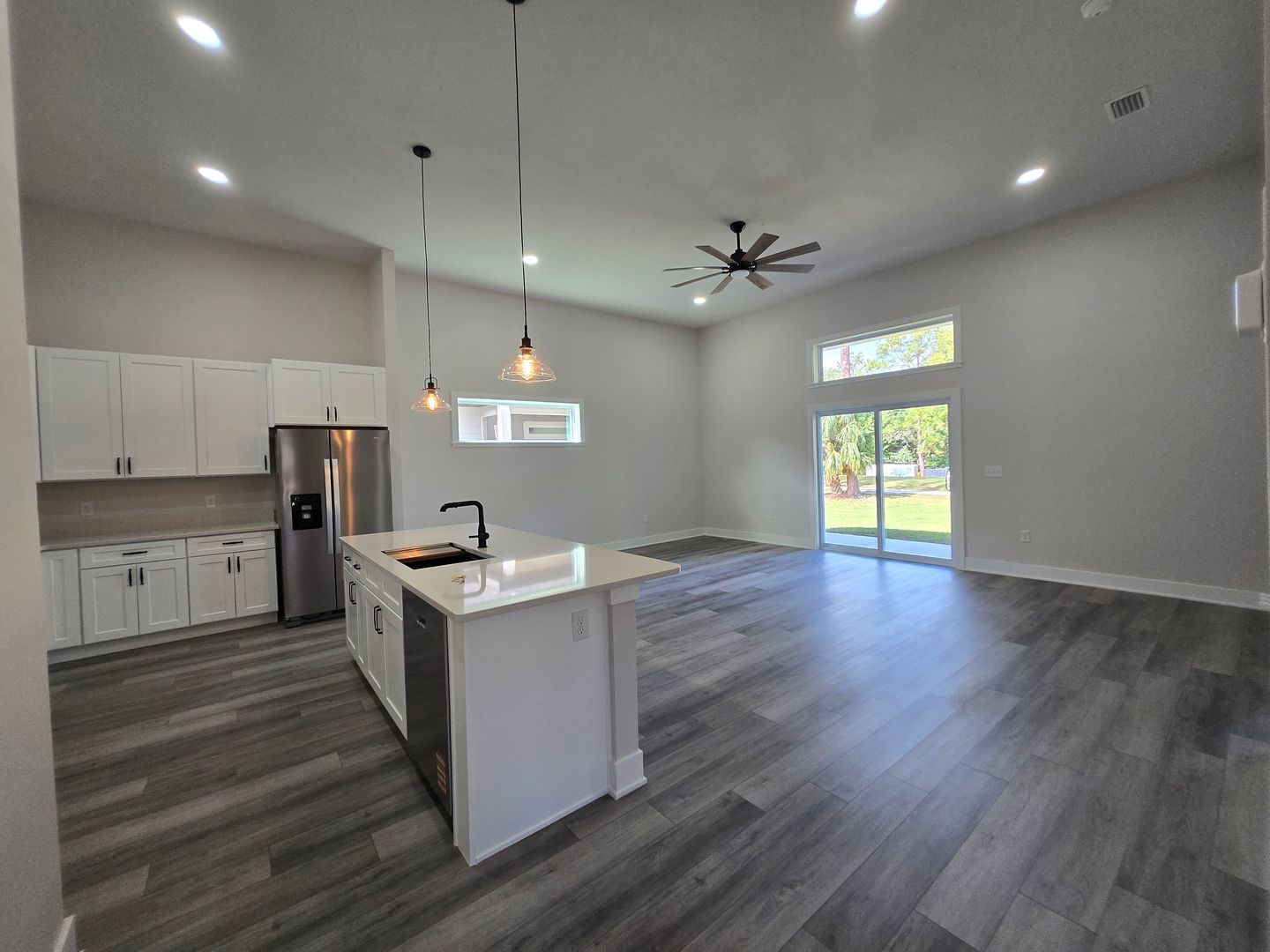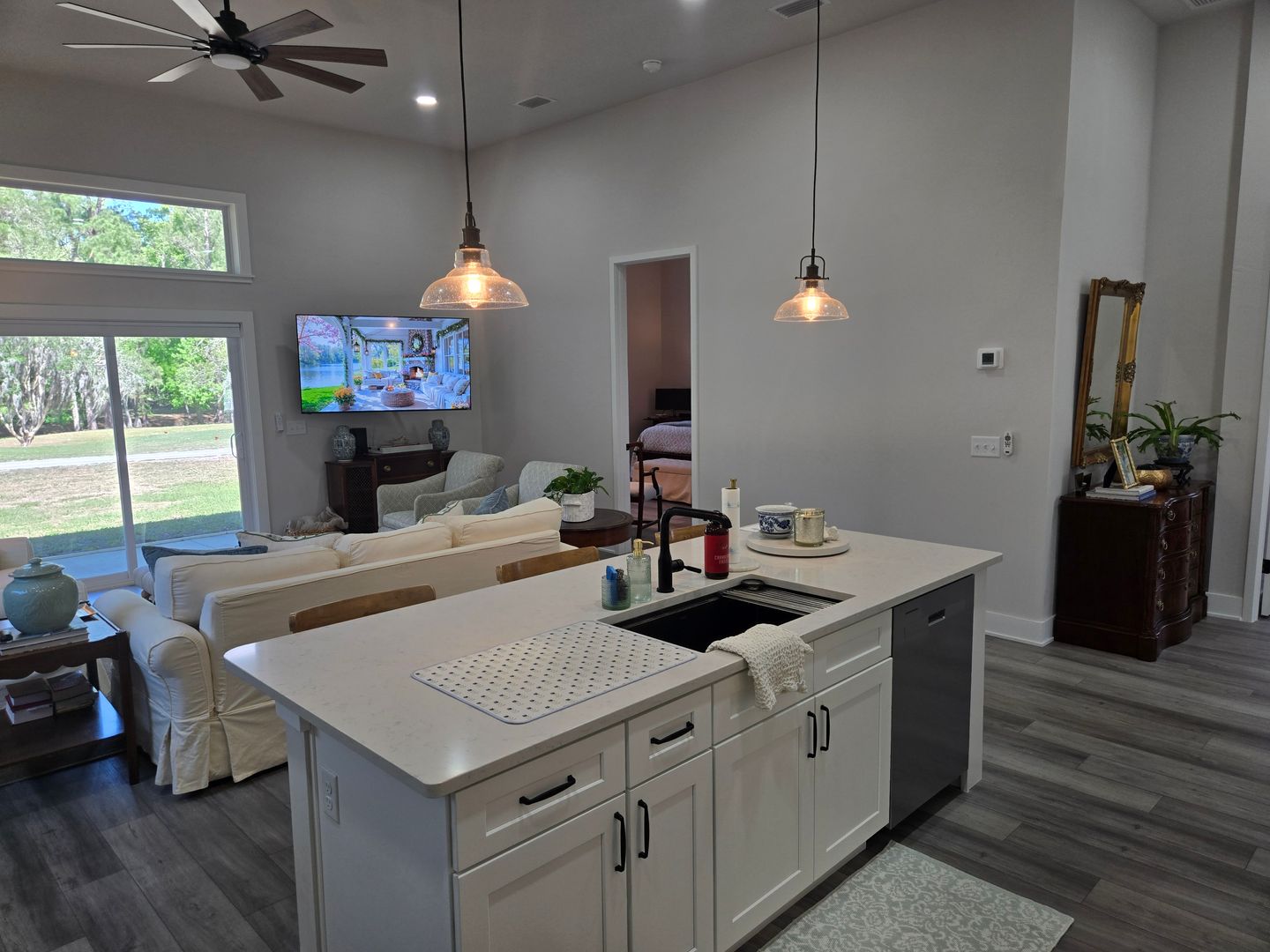 The contemporary design features sleek black fixtures, tall interior doors, and an open floor plan ideal for entertaining. A slider door in the living area opens to a covered patio with golf course views, seamlessly blending indoor and outdoor living.