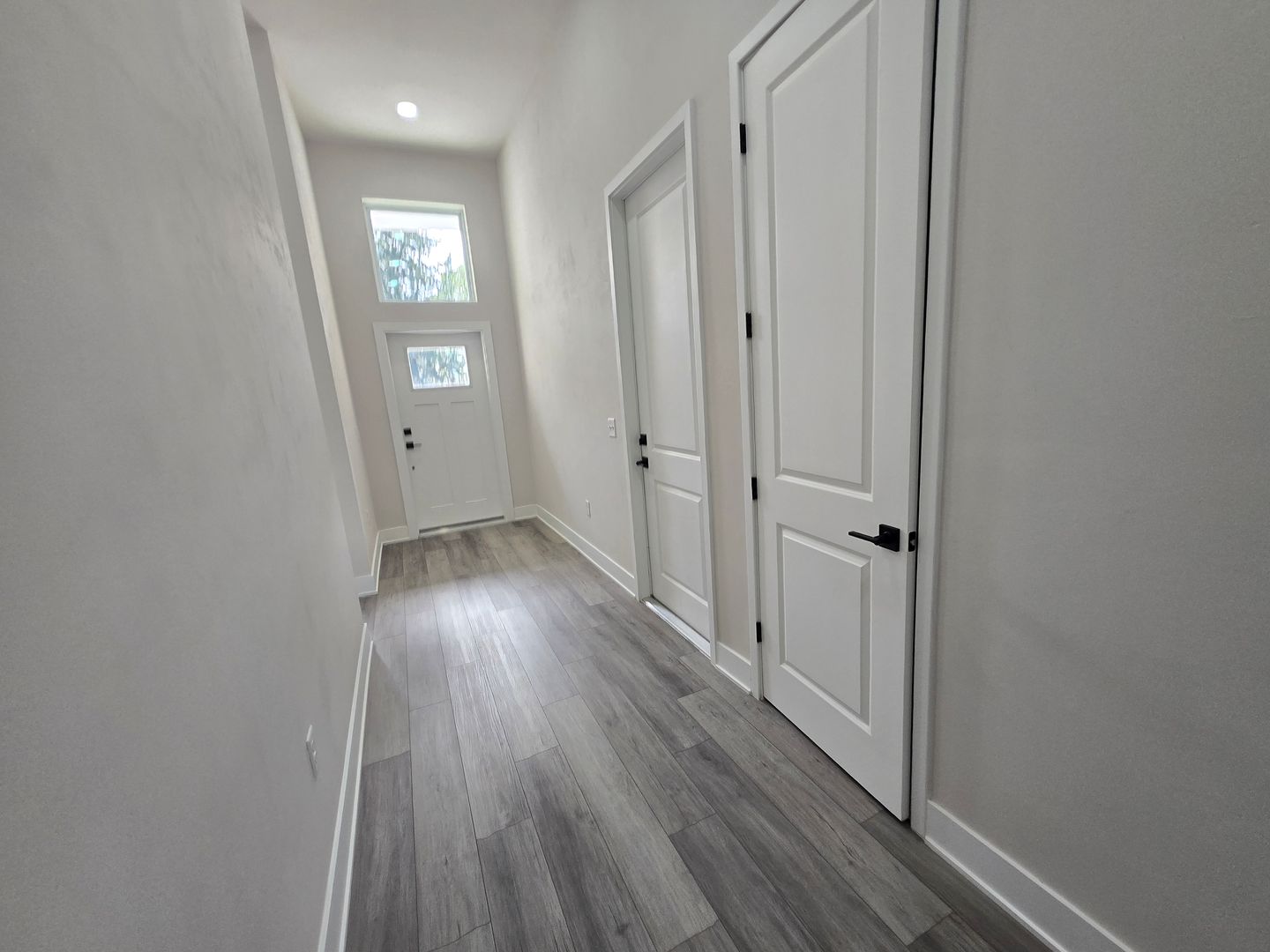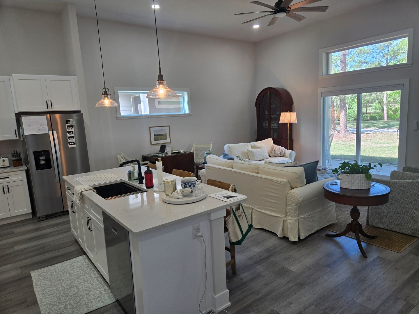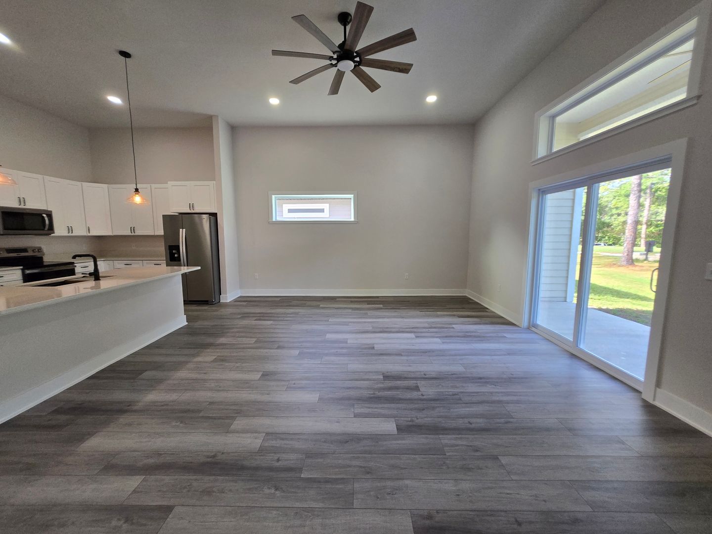 The contemporary design features sleek black fixtures, tall interior doors, and an open floor plan ideal for entertaining. A slider door in the living area opens to a covered patio with golf course views, seamlessly blending indoor and outdoor living.