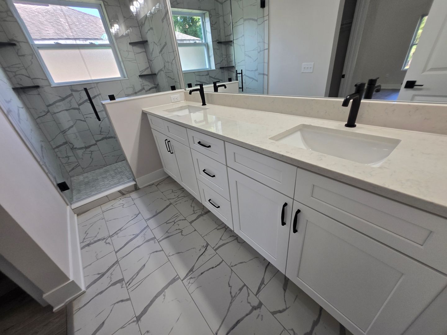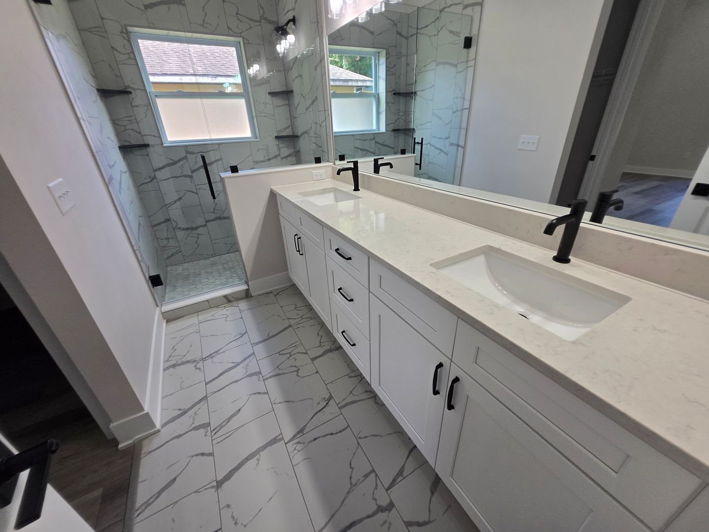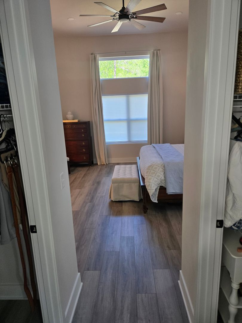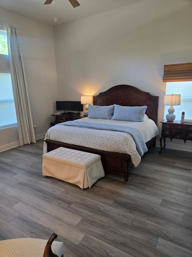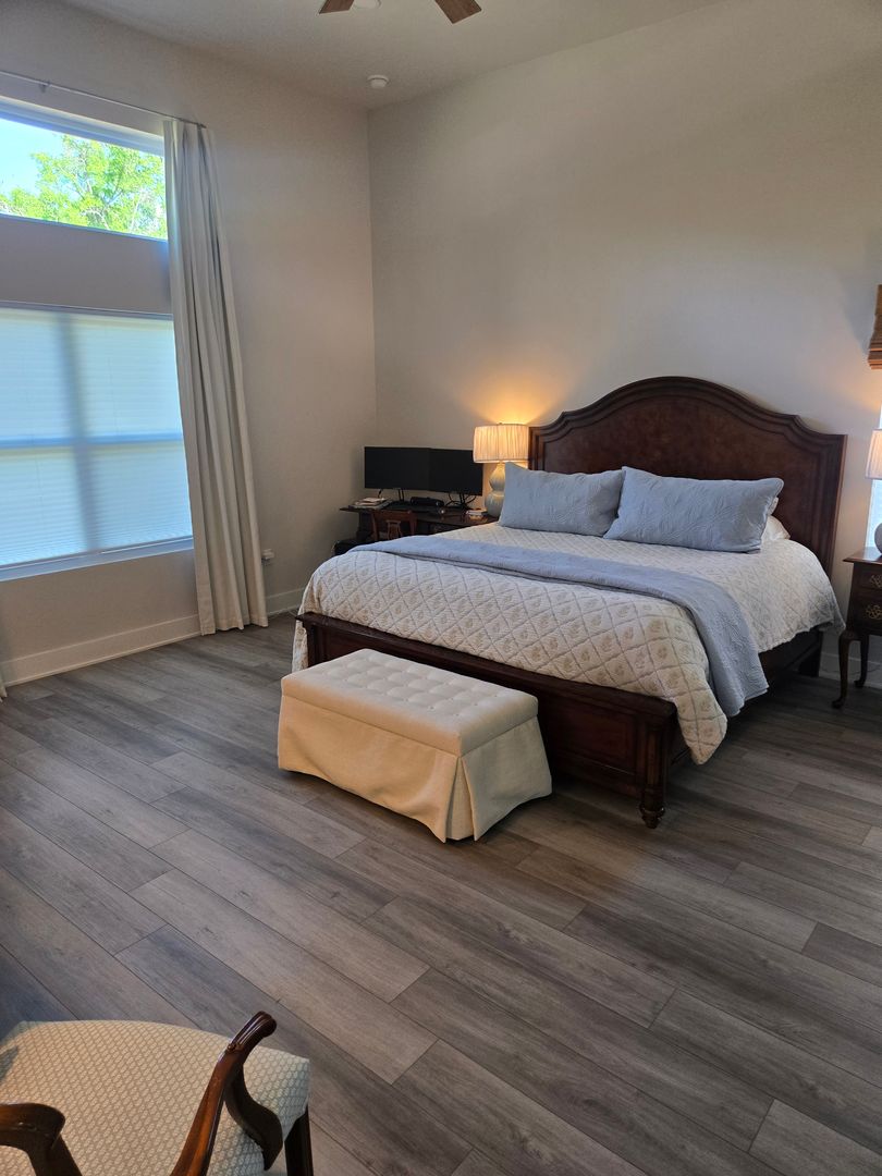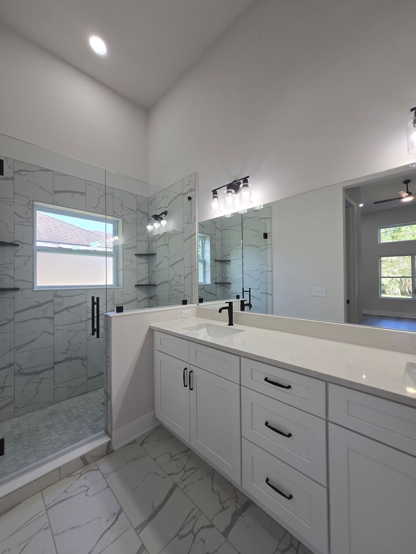 Relax in the luxurious primary suite, complete with two walk-in closets and an en-suite bath featuring a custom tiled shower stall and a double-sink vanity. The guest bathroom offers tiled floors, a single-sink vanity, and a tub/shower combo. Luxury vinyl flooring flows throughout the rest of the home, combining elegance with durability.
