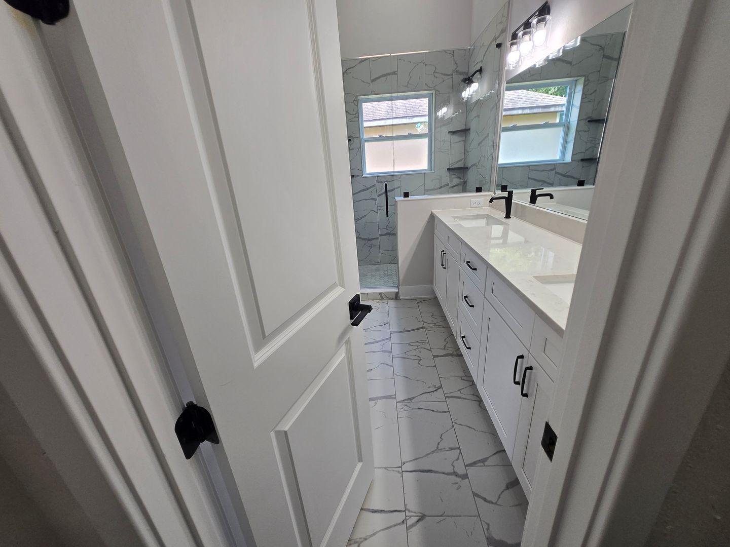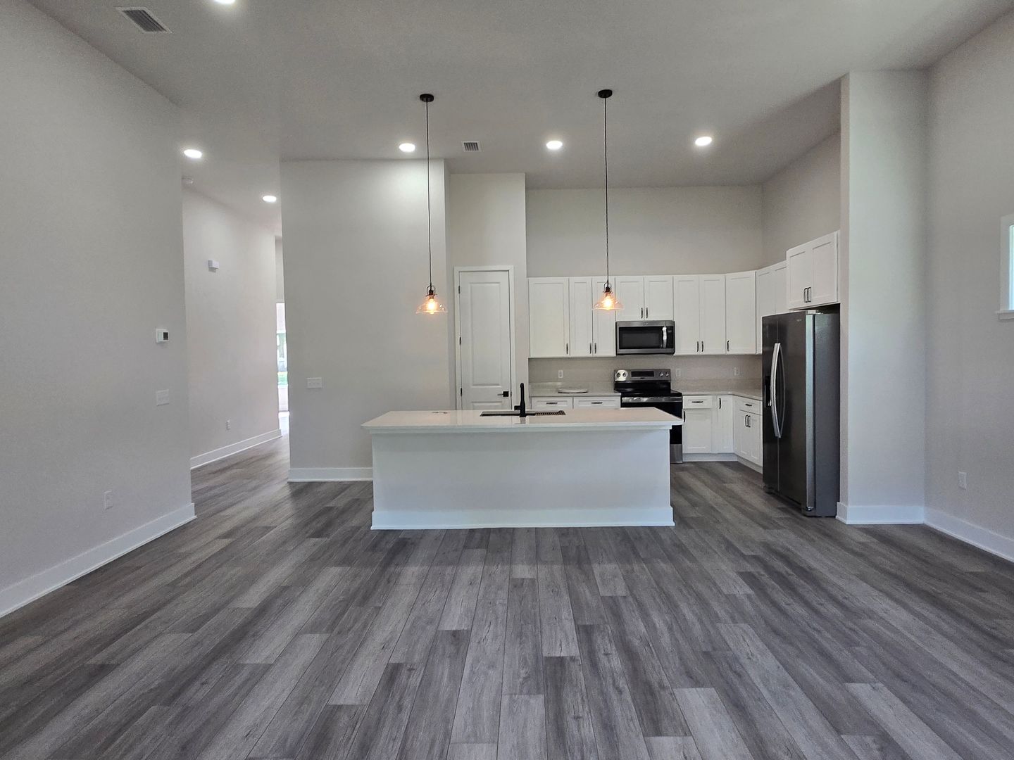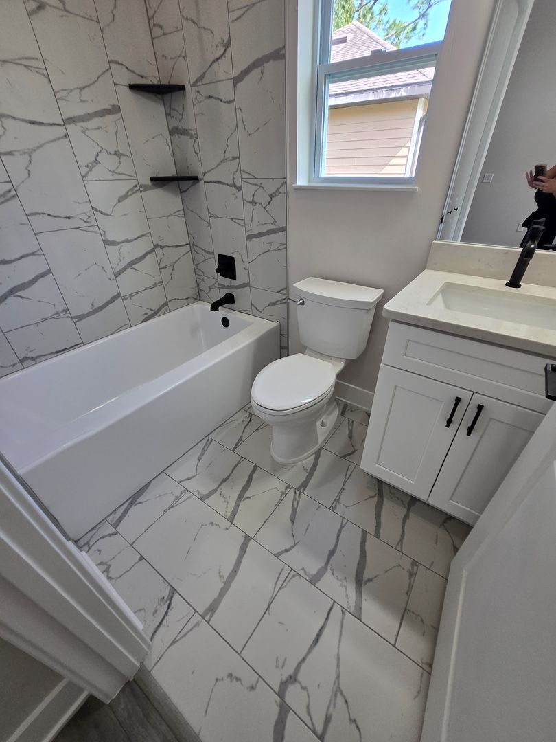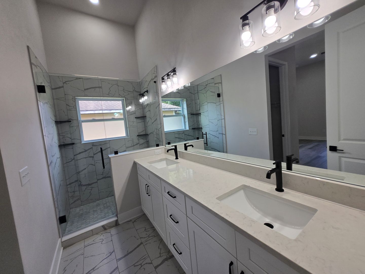 Relax in the luxurious primary suite, complete with two walk-in closets and an en-suite bath featuring a custom tiled shower stall and a double-sink vanity. The guest bathroom offers tiled floors, a single-sink vanity, and a tub/shower combo. Luxury vinyl flooring flows throughout the rest of the home, combining elegance with durability.