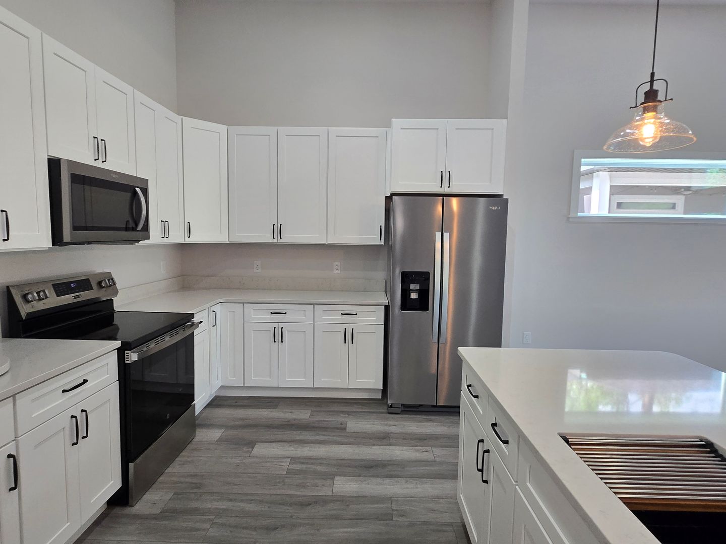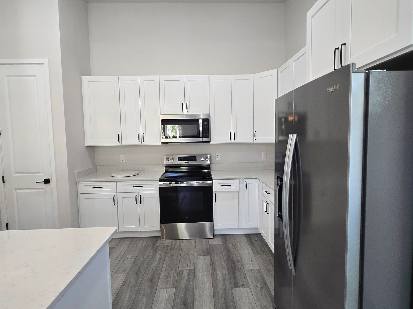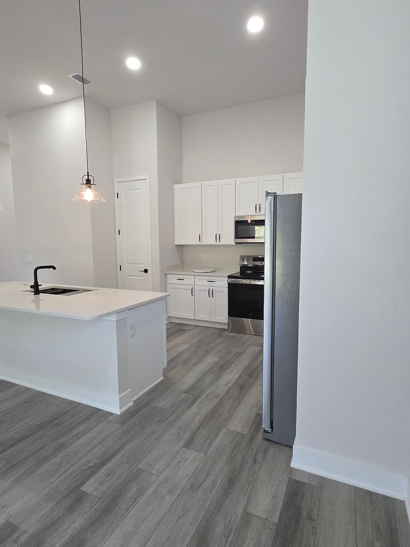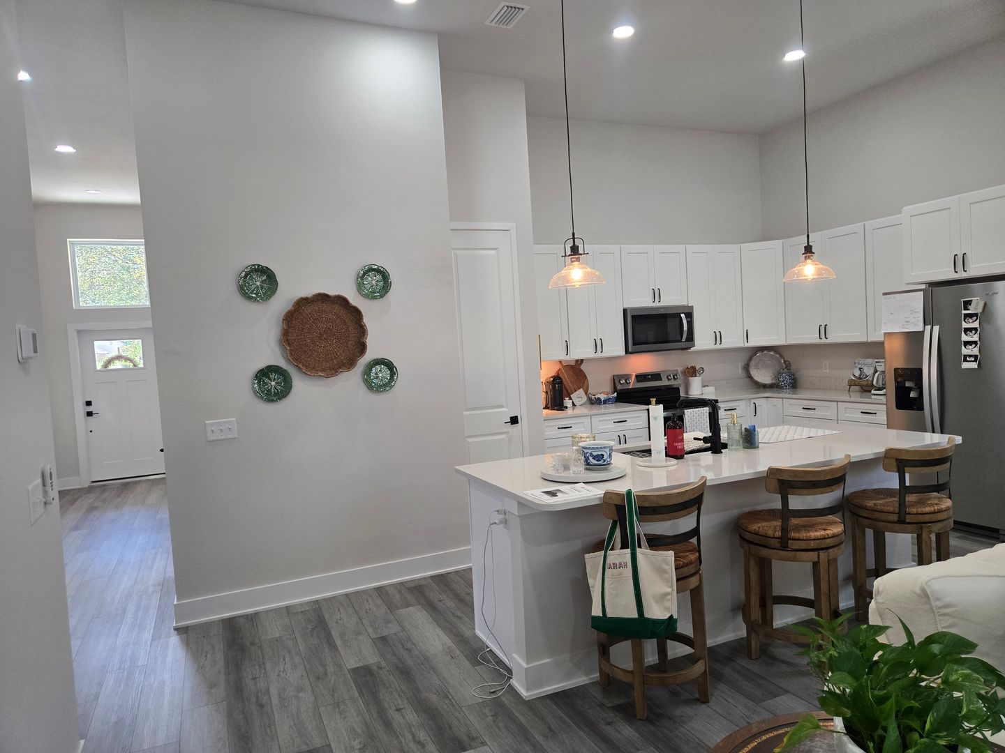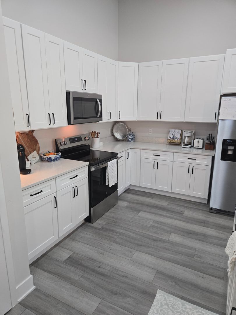 The stylish kitchen has white cabinetry, stainless steel appliances, a serving bar, and ample pantry space.