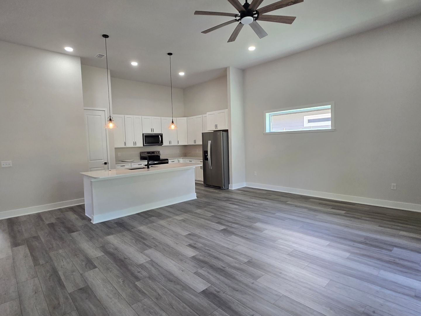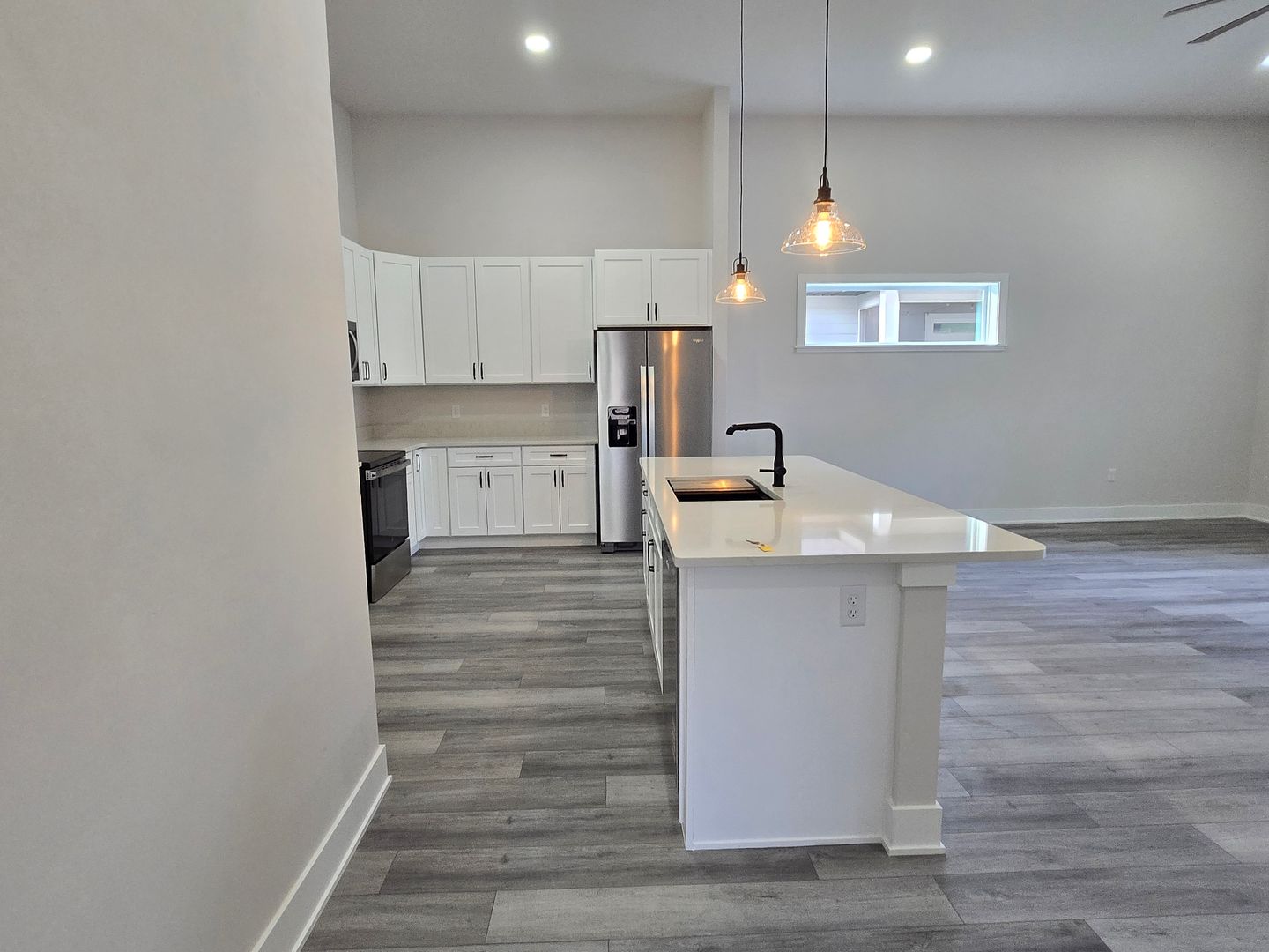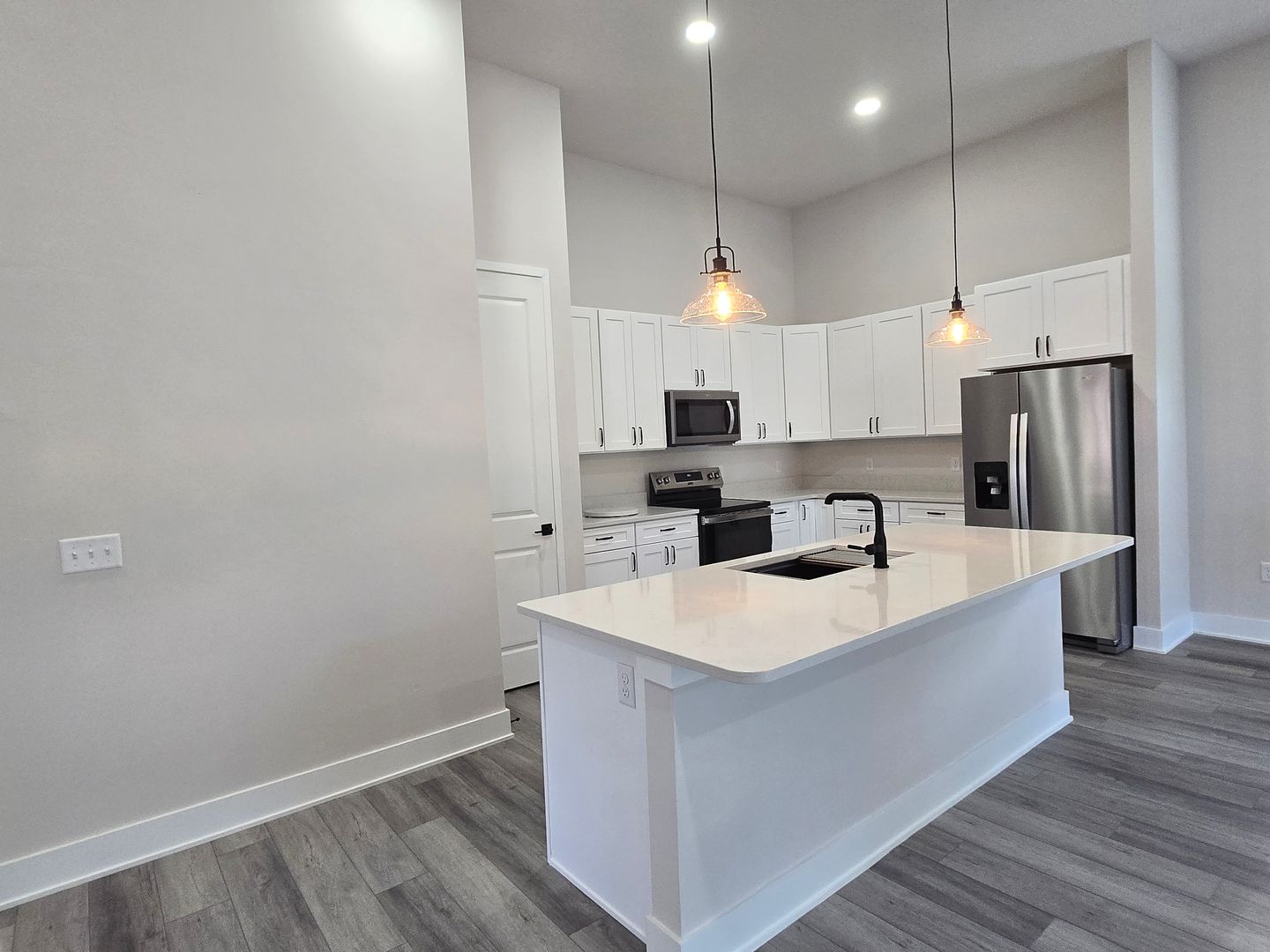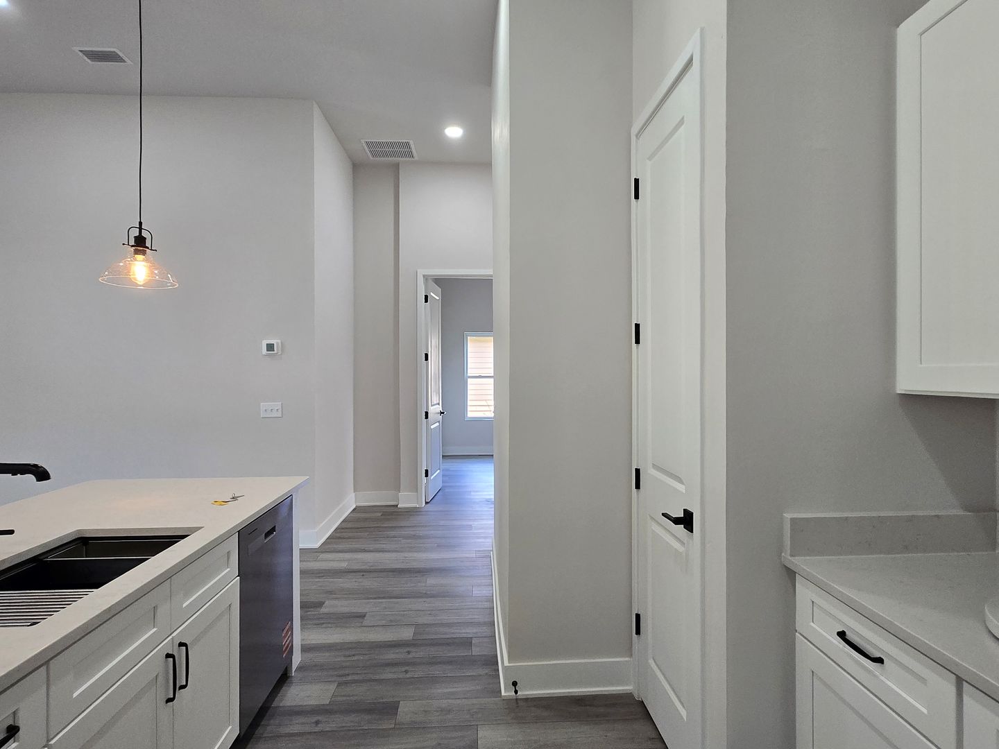The stylish kitchen has white cabinetry, stainless steel appliances, a serving bar, and ample pantry space.