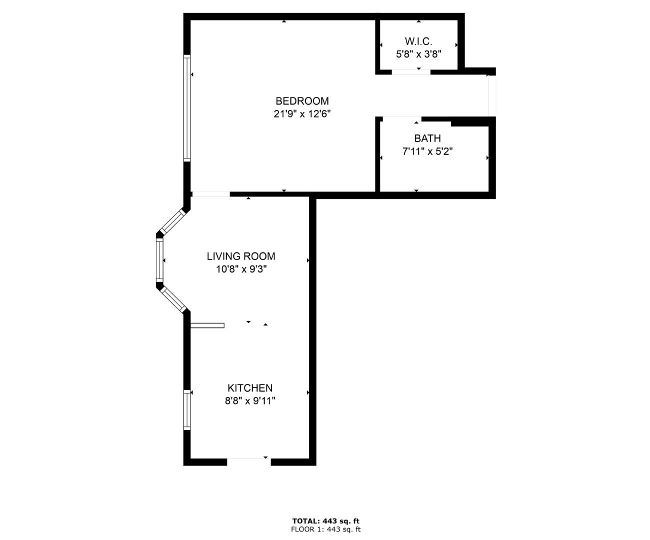 This well-appointed space features a kitchenette with eat-in area, a combined living space, separate bedroom with walk-in closet, and a full bathroom.